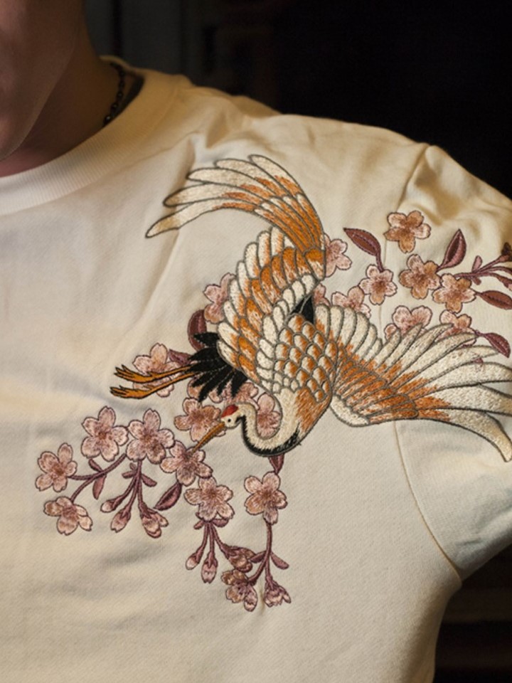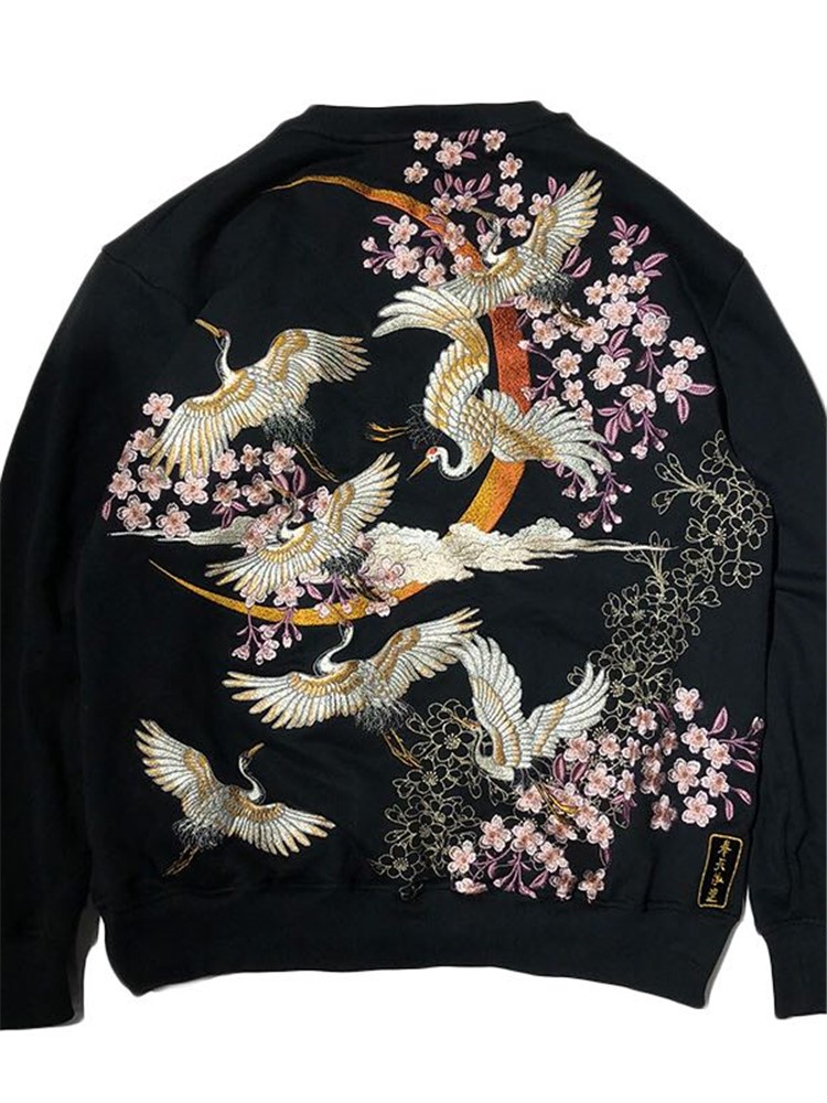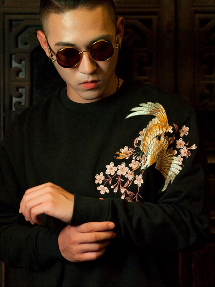 简约休闲的圆领套头卫衣,橘色的色调让整件卫衣不但休闲显瘦,还更加的清新吸睛。并且为了带出更多的时尚效果,还又特地在卫衣的背后设计了精致的仙鹤图案刺绣和字母印字装饰。这样的设计不但能够带出显著的吸睛效果,还更能够凸显出满满的时尚感。