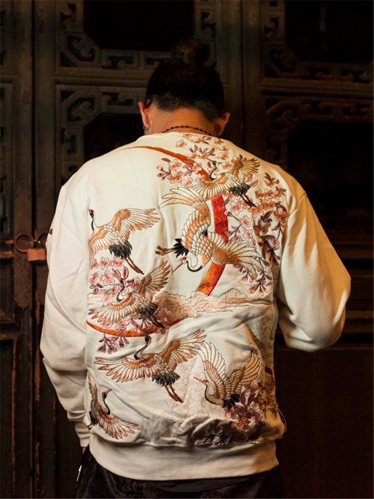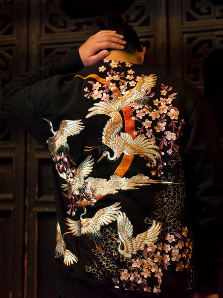 这款夹克采用的是高定横须贺缎面料子,易褶皱、勾丝,但手感柔软,色泽光亮,不粘毛,不易起球,三十八万多针立体精密进囗机绣, 一丝不苟,衣服整体非常有质感。