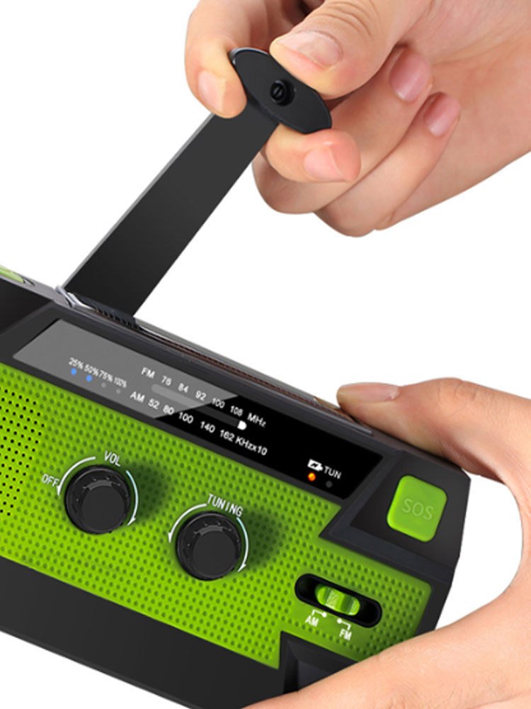 这款手摇发电机,内置可充电锂电池,可通过太阳能和手摇进行充电,提供了新闻、天气预报、听收音机的功能,也可以充当LED手电筒,还能为智能手机和平板电脑充电,无论是工作中,还是在户外,又或是在家中,都能非常地实用。