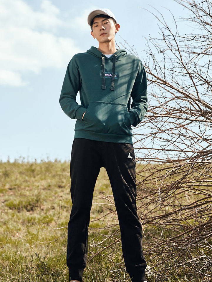 抽绳连帽卫衣,胸口字母设计,增加亮点。前面大口袋设计,便于置物。