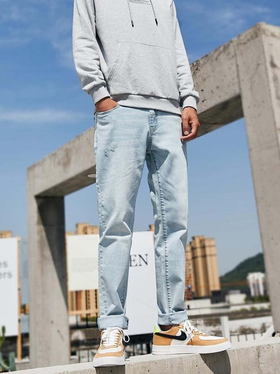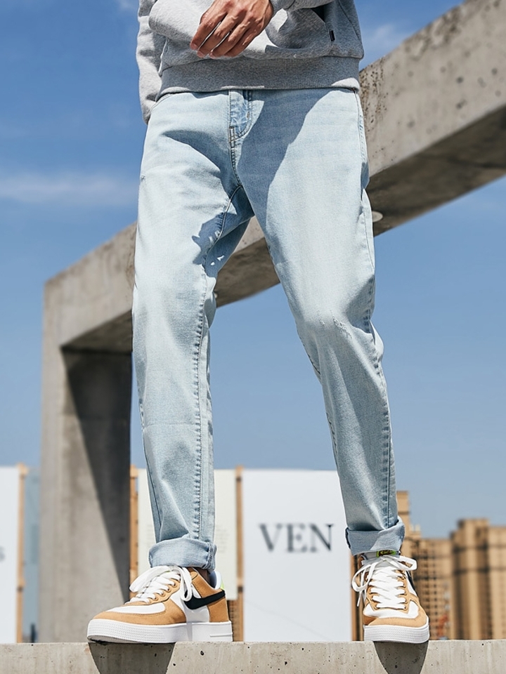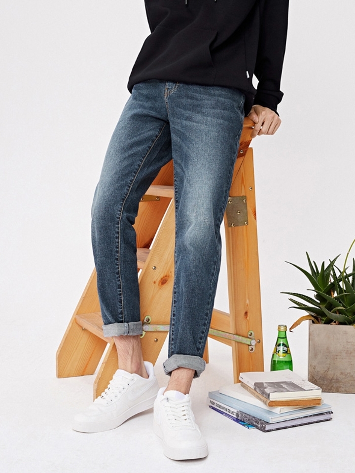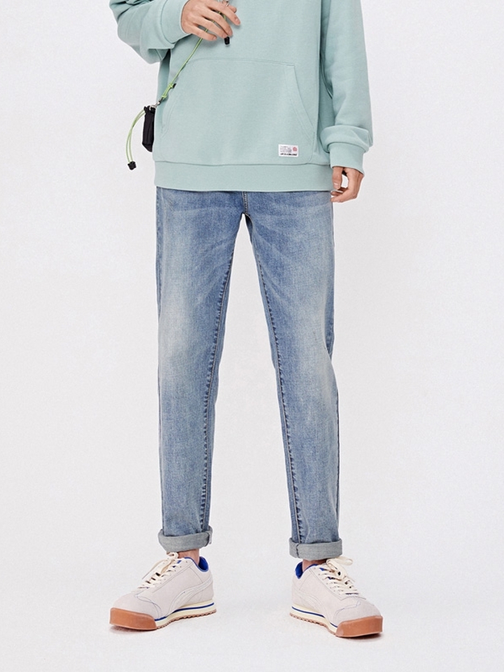采用韩版直筒版型设计,柔软舒适,裤腿经过磨白、猫须设计,视觉上完美修饰腿部线条,时尚而不花哨。