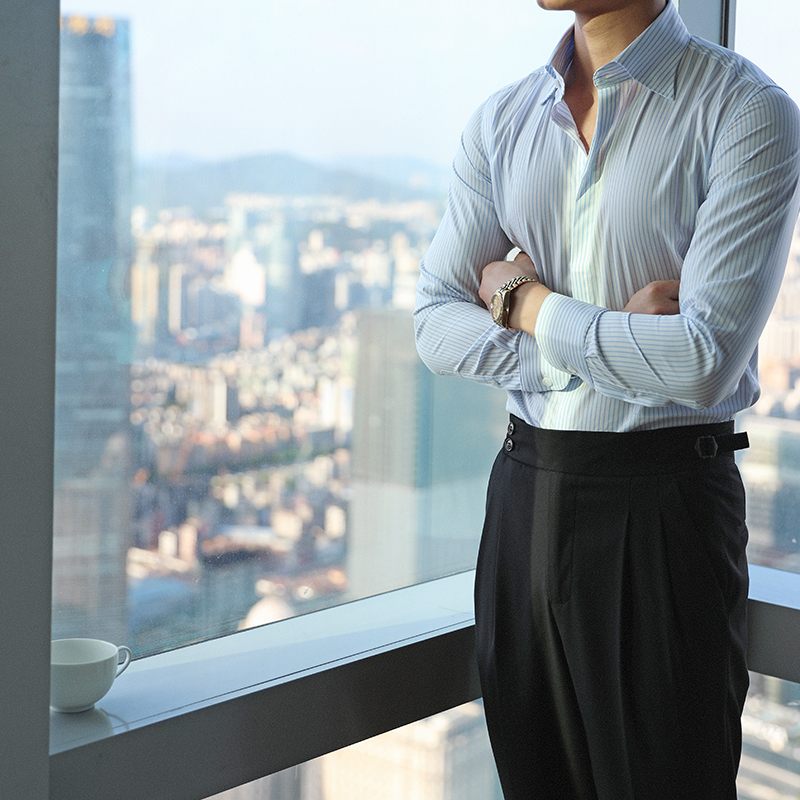 简约的高腰设计,搭配上修身的版型,上身显瘦又显高。