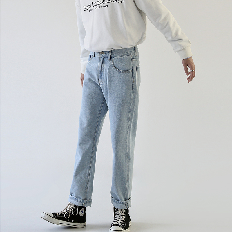 高腰设计,拉长身材比例。高腰牛仔裤,显瘦显腿长。直筒裤型,修饰腿部线条。