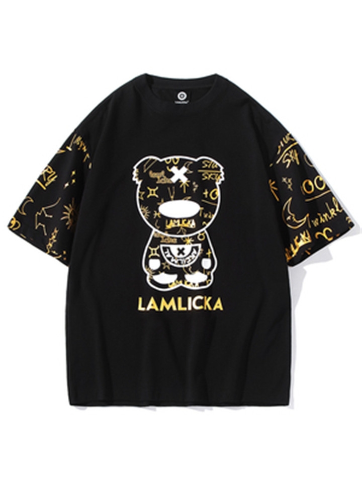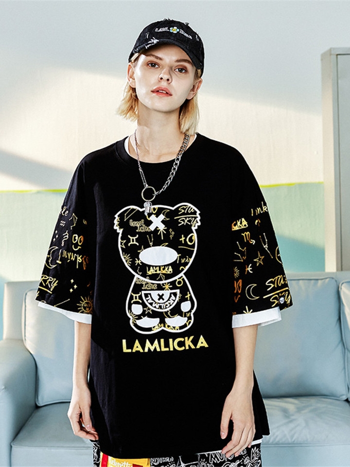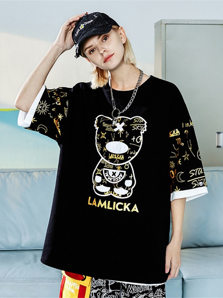 这件T恤,最亮眼的地方莫过于胸前的可爱烫金熊猫,上身后走在人群中非常亮眼,周围的人能一下子注意到你,搭配鸭舌帽与拼接直筒裤,更为的抢眼吸睛。