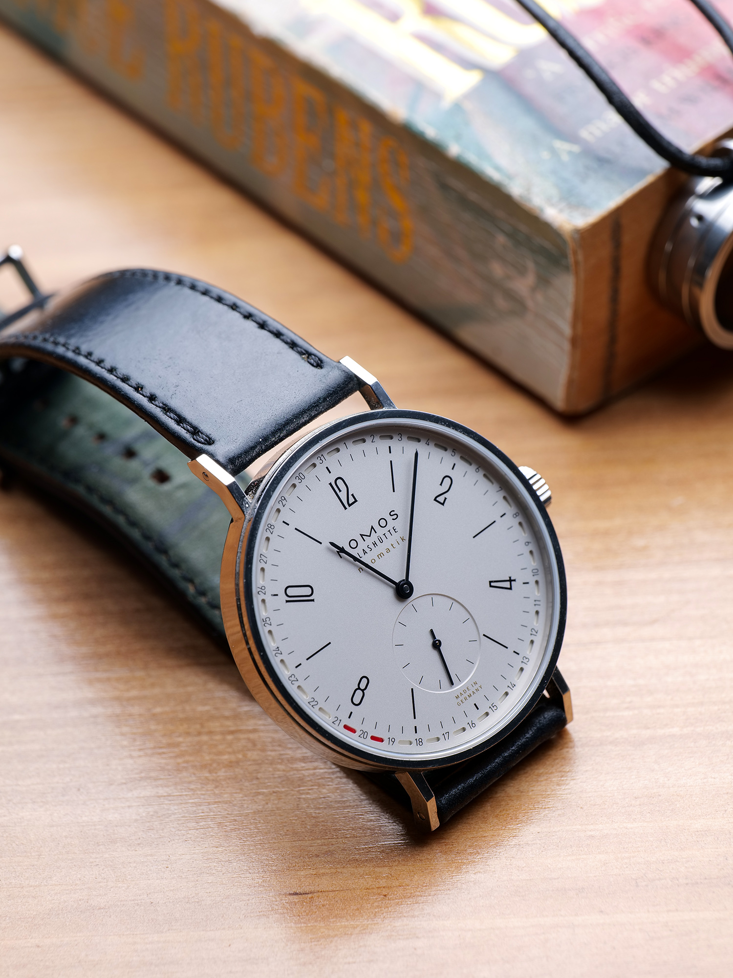 说起NOMOS,表主们第一时间联想到的应该是包豪斯理念的设计风格。这款NOMOS的经典代表作TANGENTE180,则可以完美诠释“形随功能而生”的概念。简约流畅的线条,辅以细长纤巧的阿拉伯数字,让视觉感更清新明快。经典又得体的黑白双色搭配,为整枚腕表奠定了沉稳中性的基调。