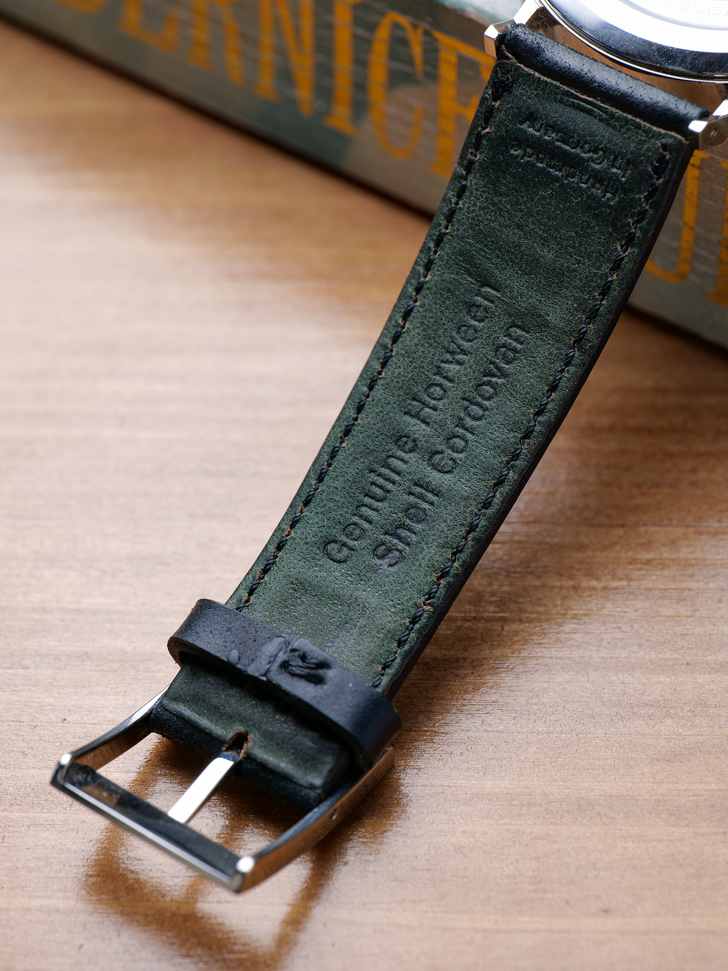 腕表配备的是霍尔文高级科尔多瓦马皮表带,专门选用了马臀皮,质感细腻油光饱满,它也被誉为“皮中贵族”。这种材质的表带经过一段时间的佩戴,会愈发地贴合手腕,柔软亲肤,逐渐析出油光效果,光泽感也会越来越好。
