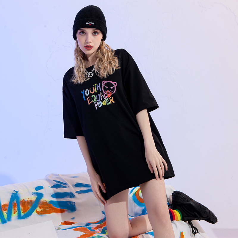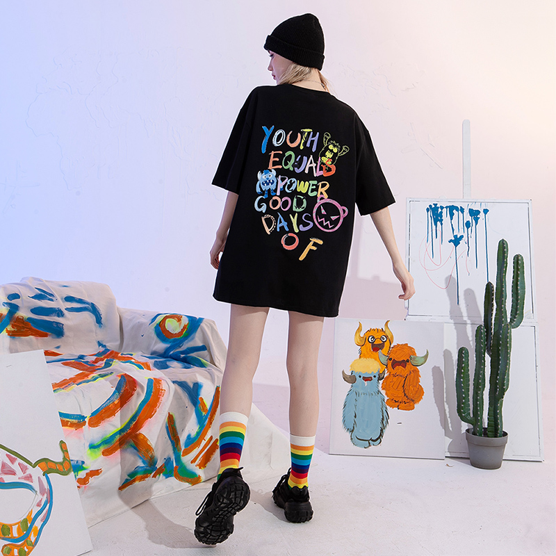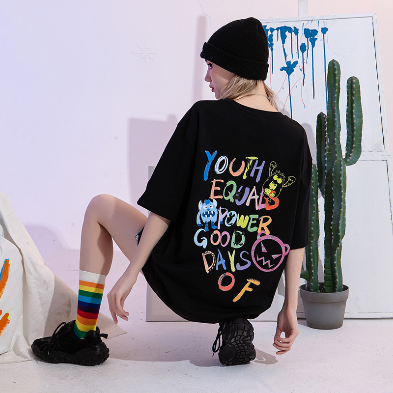这款t恤是简约的风格,宽松的版型,时尚百搭,胸前的字母印花,很有个性,搭配牛仔裤或者短裤都很好看。