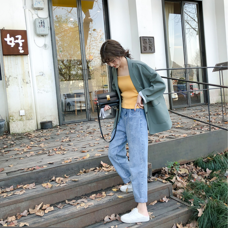高腰设计,拉长身材比例。高腰牛仔裤,显瘦显腿长。直筒裤型,修饰腿部线条。