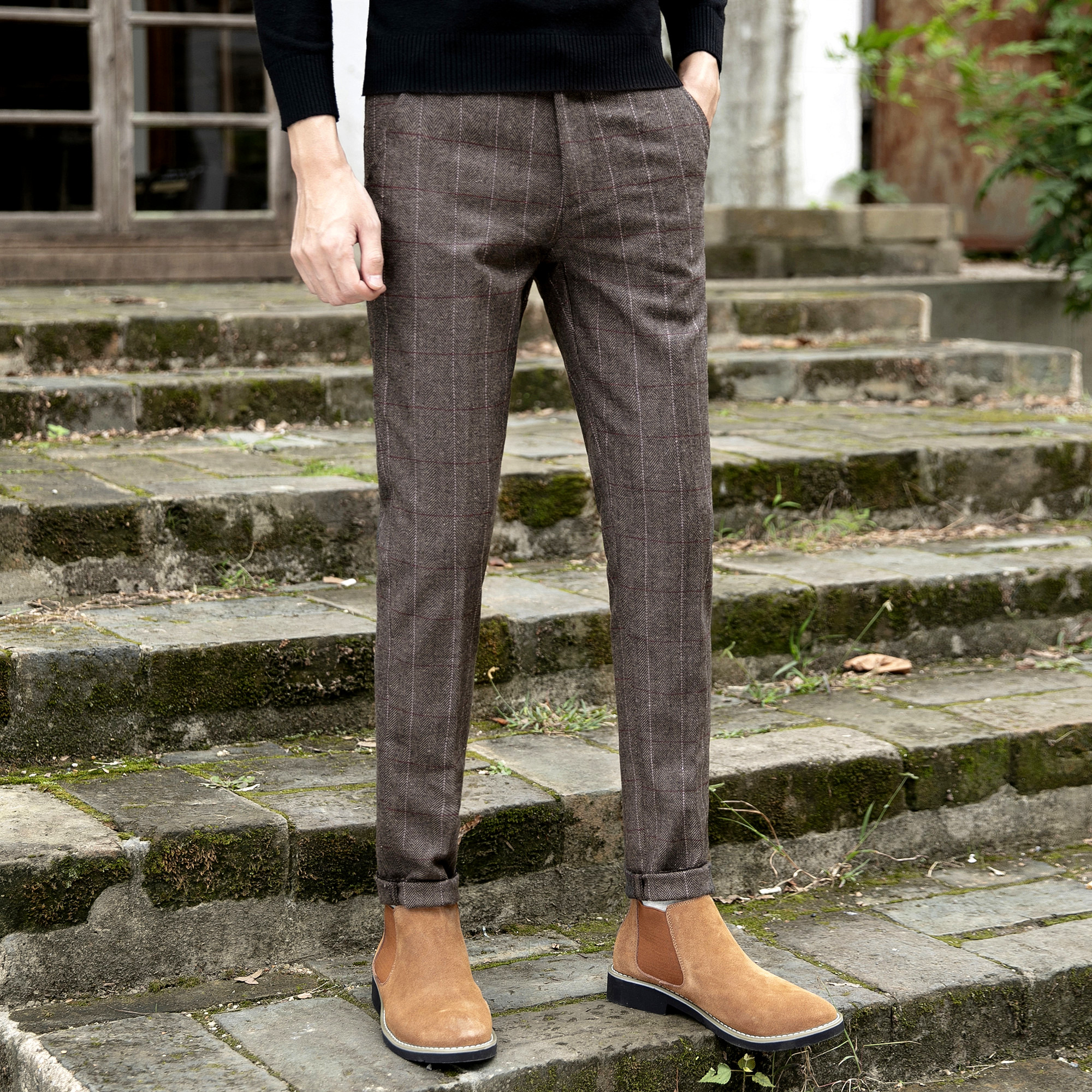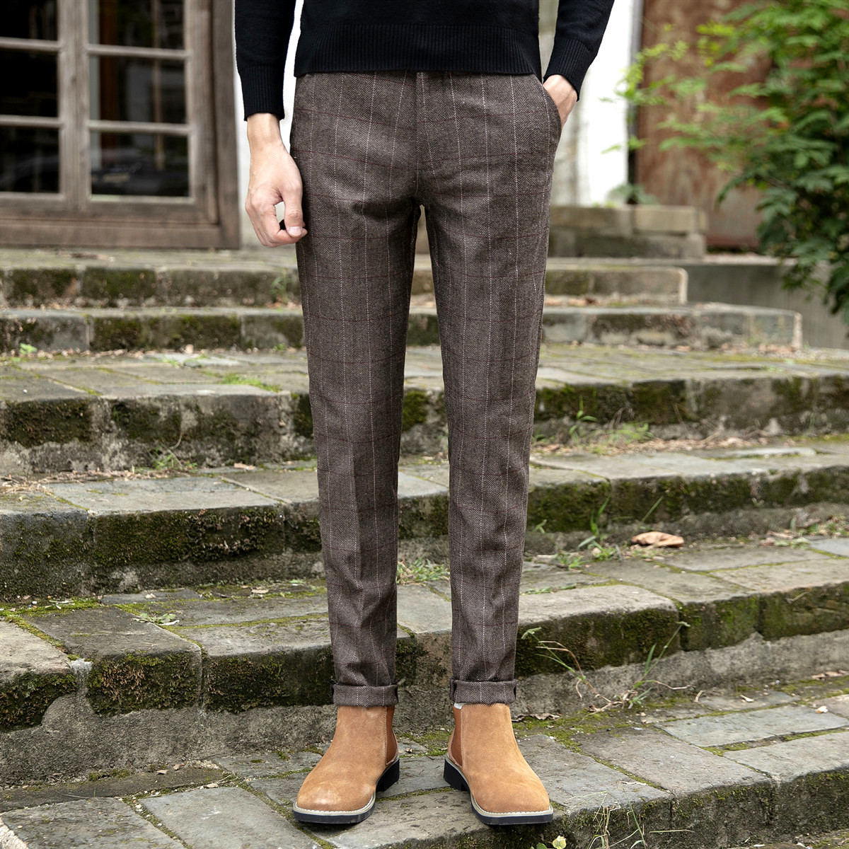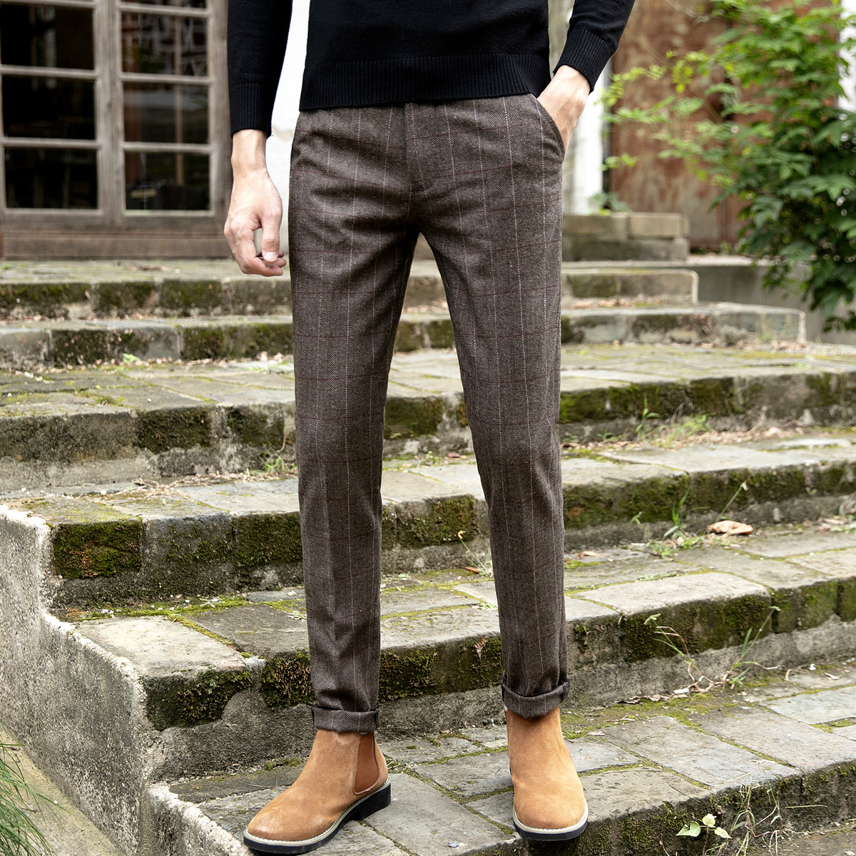 高腰的设计,拉长腿部线条,显瘦效果很好,高腰的版型,很显高挑,修身的剪裁,修饰腿部曲线,上身很有范。