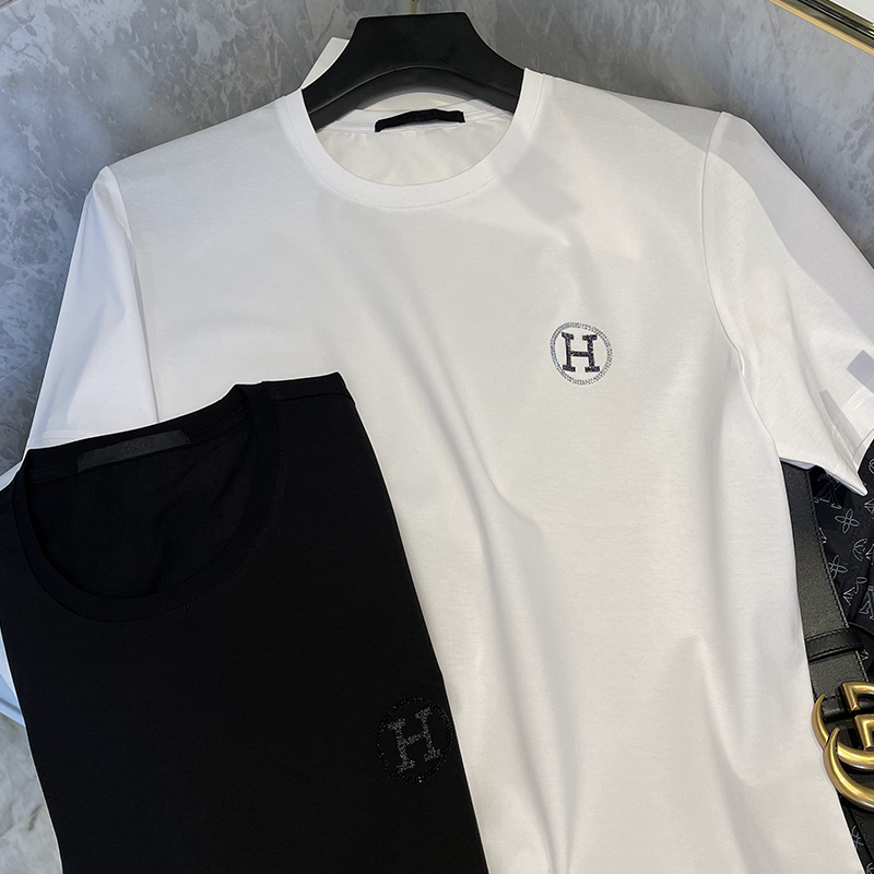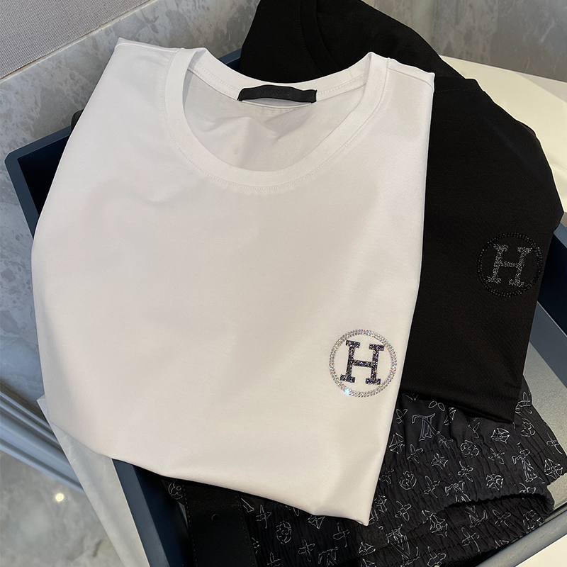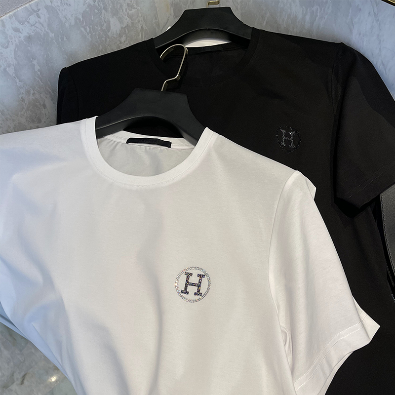 真丝面料,穿着舒适亲肤,短袖设计,修饰手臂线条,个性印花,时尚潮流,烫钻图案,彰显时尚个性。