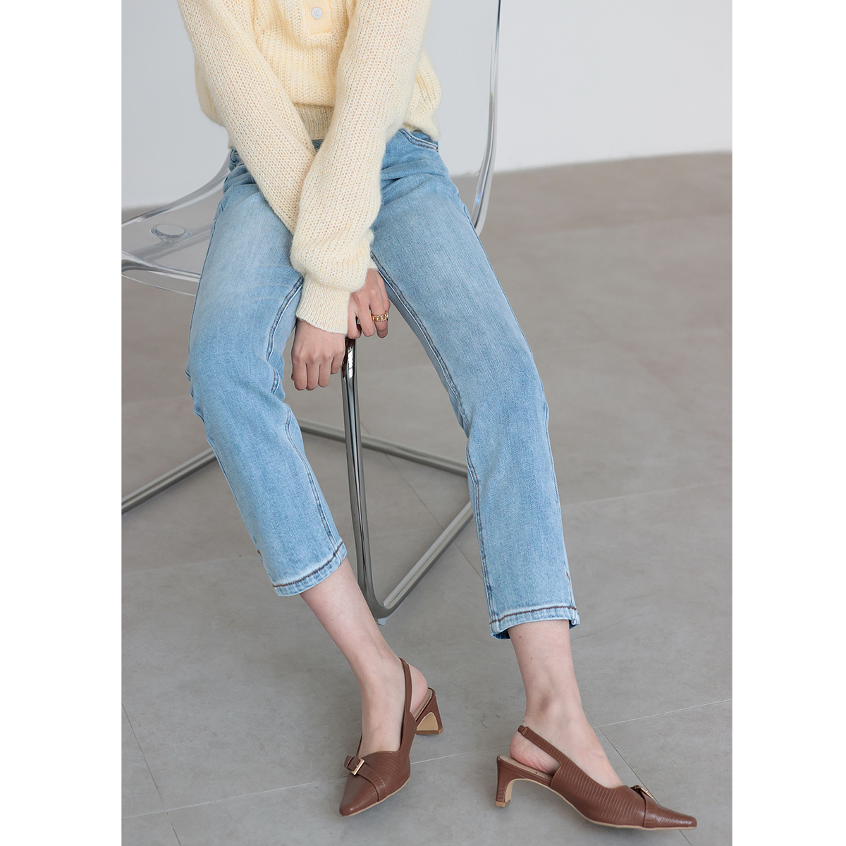 高腰设计,拉长身材比例。高腰牛仔裤,显瘦显腿长。直筒裤型,修饰腿部线条。