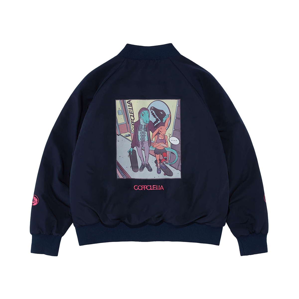 夹克版型,修饰身材比例。精选优质面料,舒适保暖。胸前刺绣图案,个性时尚。
