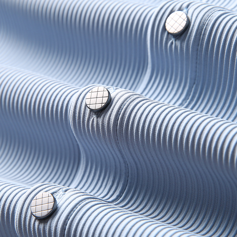条纹元素点缀,打破纯色的单调,增添时尚吸晴指数。采用了立领领部的款式,可以修饰脖颈之感。