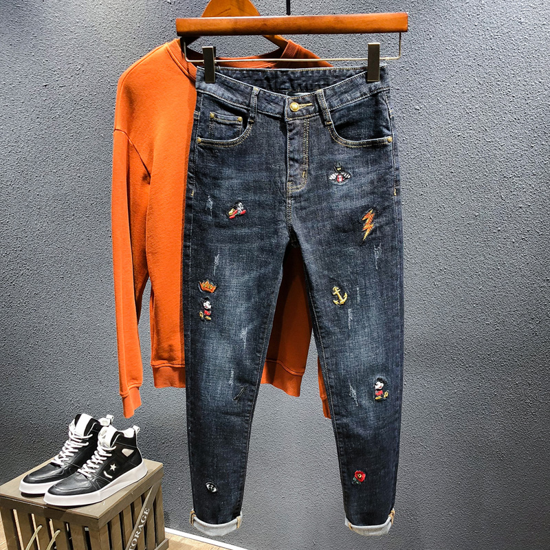 高腰设计,拉长身材比例。高腰牛仔裤,显瘦显腿长。直筒裤型,修饰腿部线条。