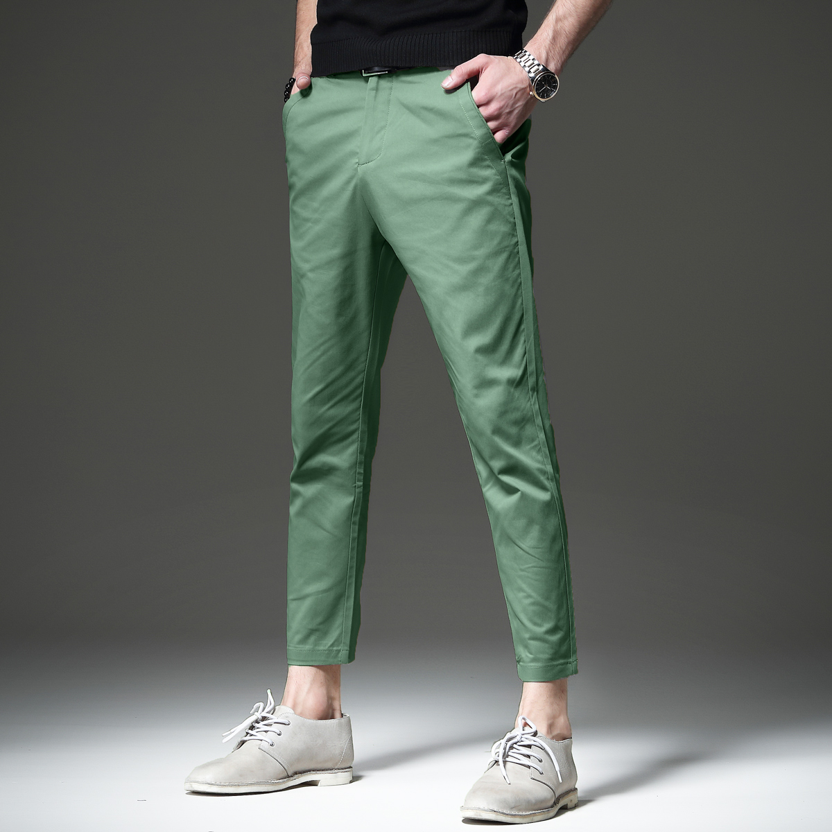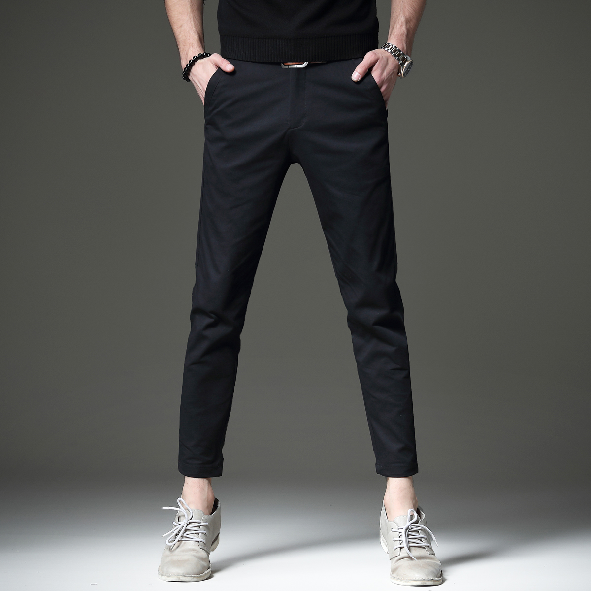 高腰的设计,拉长腿部线条,显瘦效果很好,高腰的版型,很显高挑,修身的剪裁,修饰腿部曲线,上身很有范。