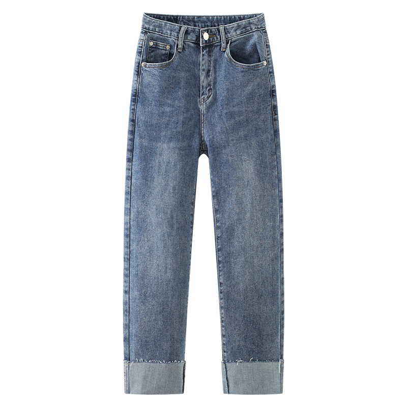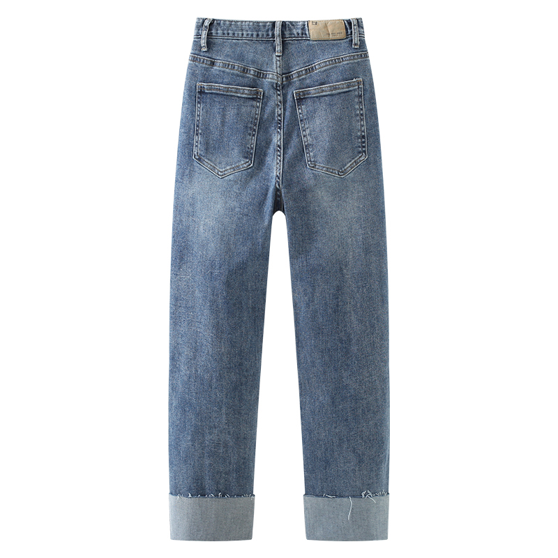 高腰设计,拉长身材比例。高腰牛仔裤,显瘦显腿长。直筒裤型,修饰腿部线条。