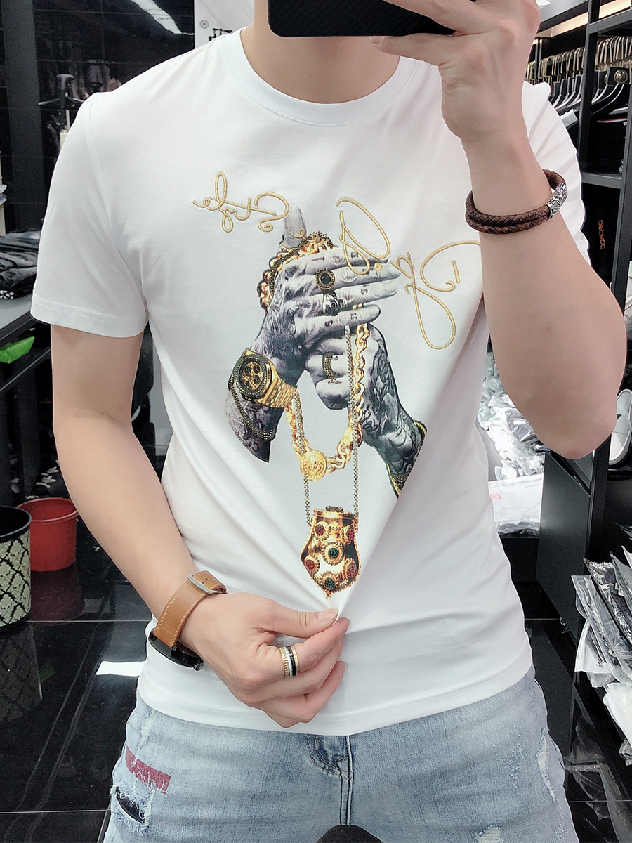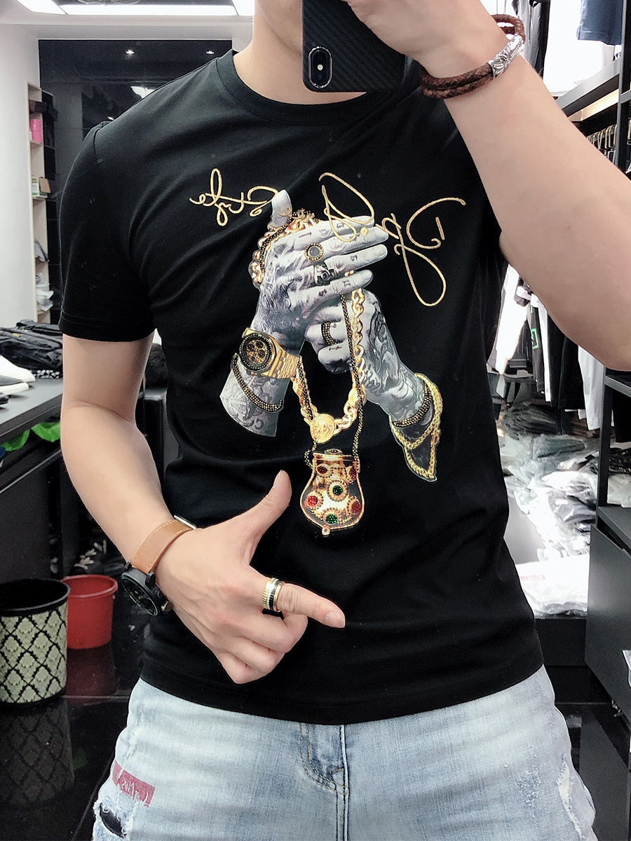 精致烫钻工艺,潮流感十足,胸前印花设计,时尚潮流,短袖设计,修饰手臂线条,优质冰丝,穿着舒适透气。