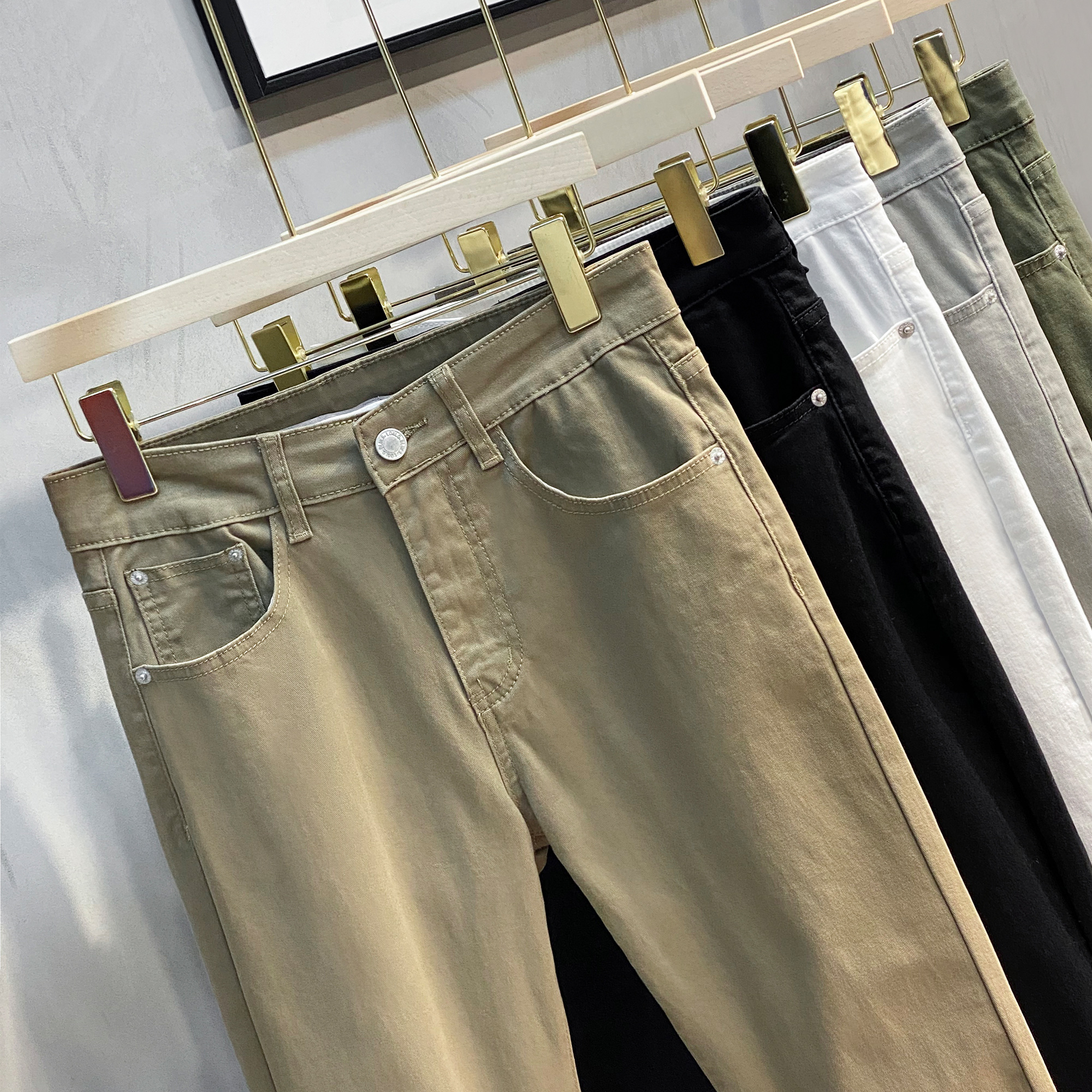 高腰的设计,拉长腿部线条,显瘦效果很好,高腰的版型,很显高挑,修身的剪裁,修饰腿部曲线,上身很有范。