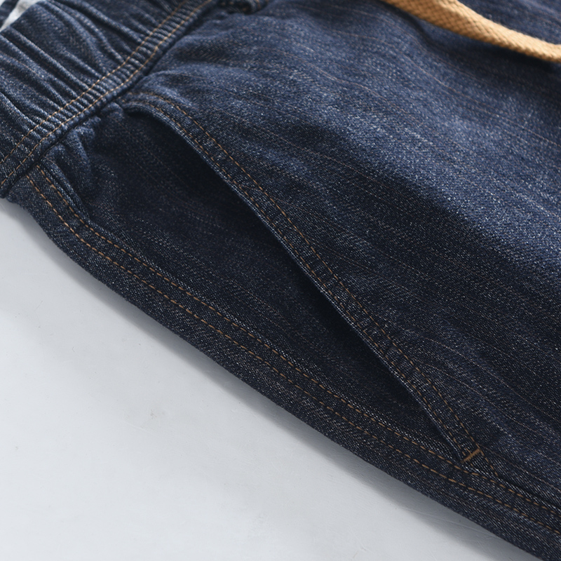 两侧斜插的拼接设计,营造层次感。休闲裤长,修饰腿部比例。水洗做旧处理,尽显浓郁的怀旧气质。