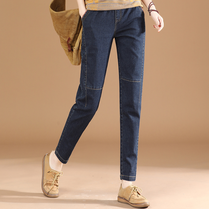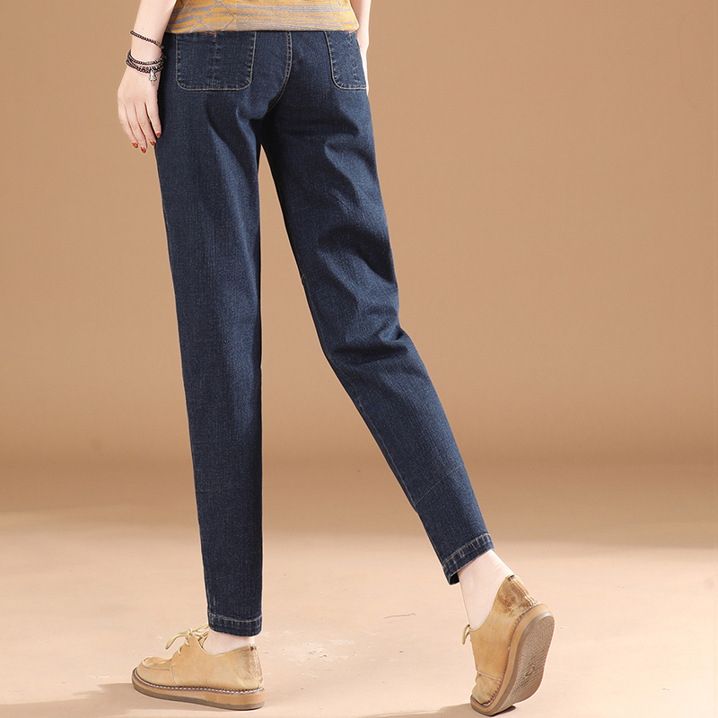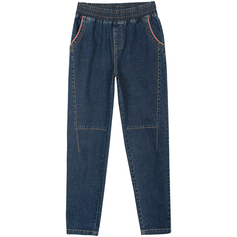 九分版型,露出纤细脚踝,宽松的版型,穿着舒适自在,纯棉牛仔面料,舒适透气,长裤设计,修饰腿部线条。