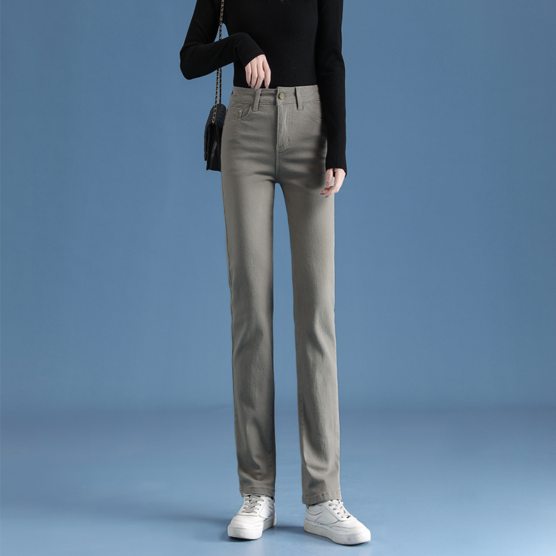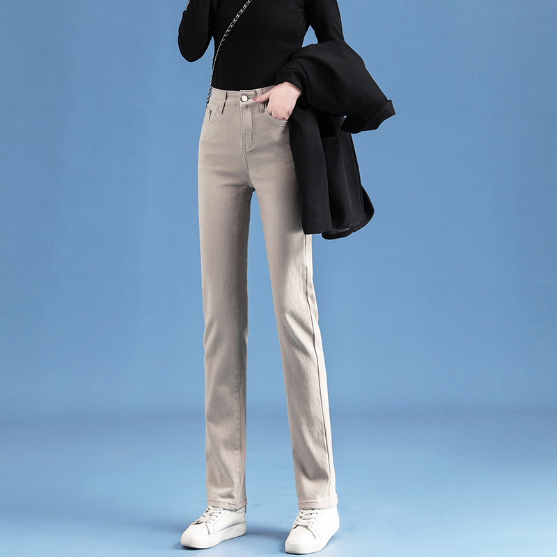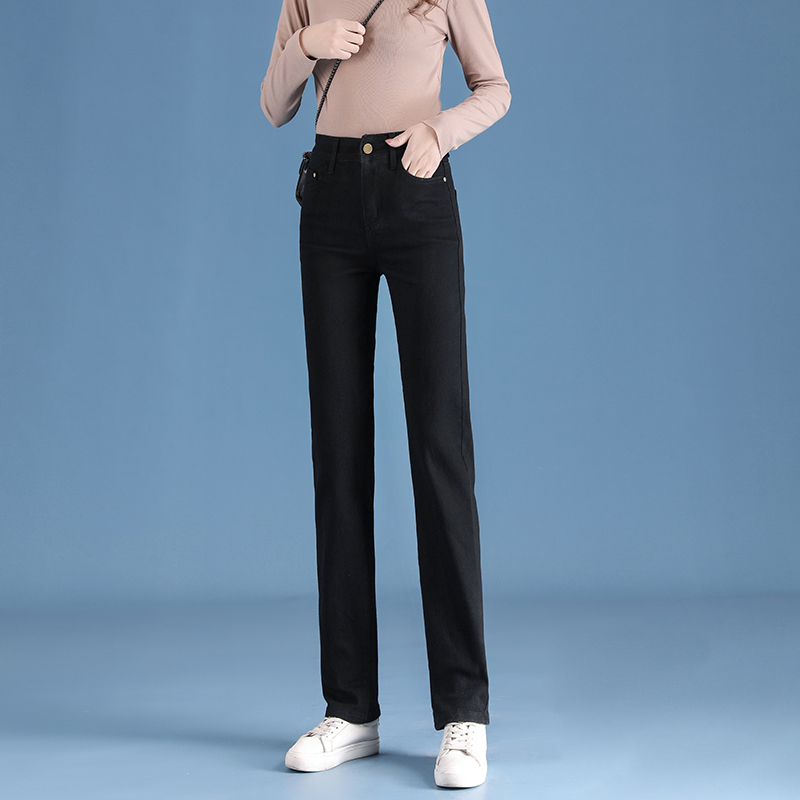 高腰设计,拉长身材比例。高腰牛仔裤,显瘦显腿长。直筒裤型,修饰腿部线条。