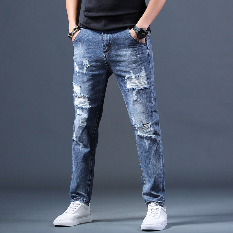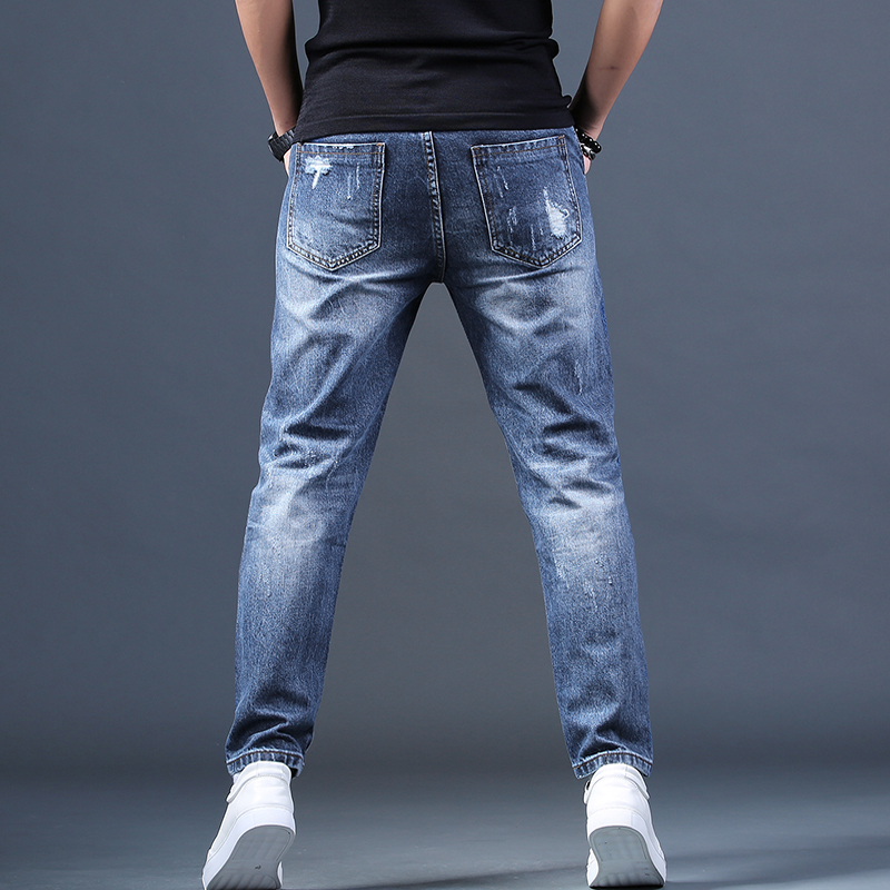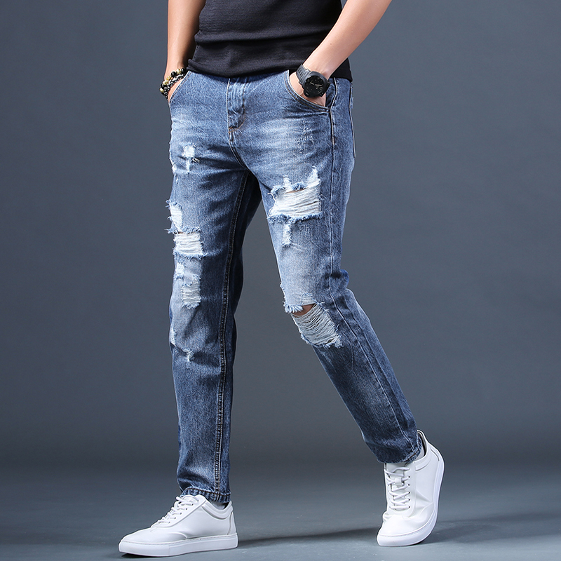 简约又修身小脚的牛仔裤,裤身破洞点缀,时髦感十足。一双高帮帆布鞋,就能打造出街头范儿。