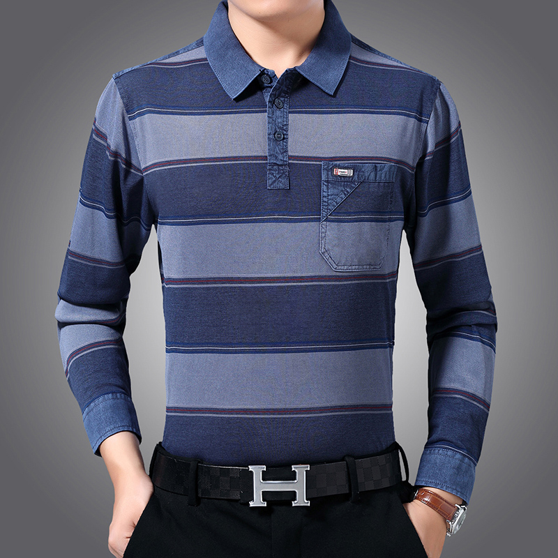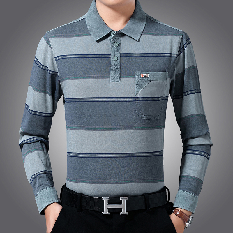 休闲条纹长袖衫,搭配上时尚有型的纯色直筒长裤,让这款圆领打底T恤穿着更加帅气十足。