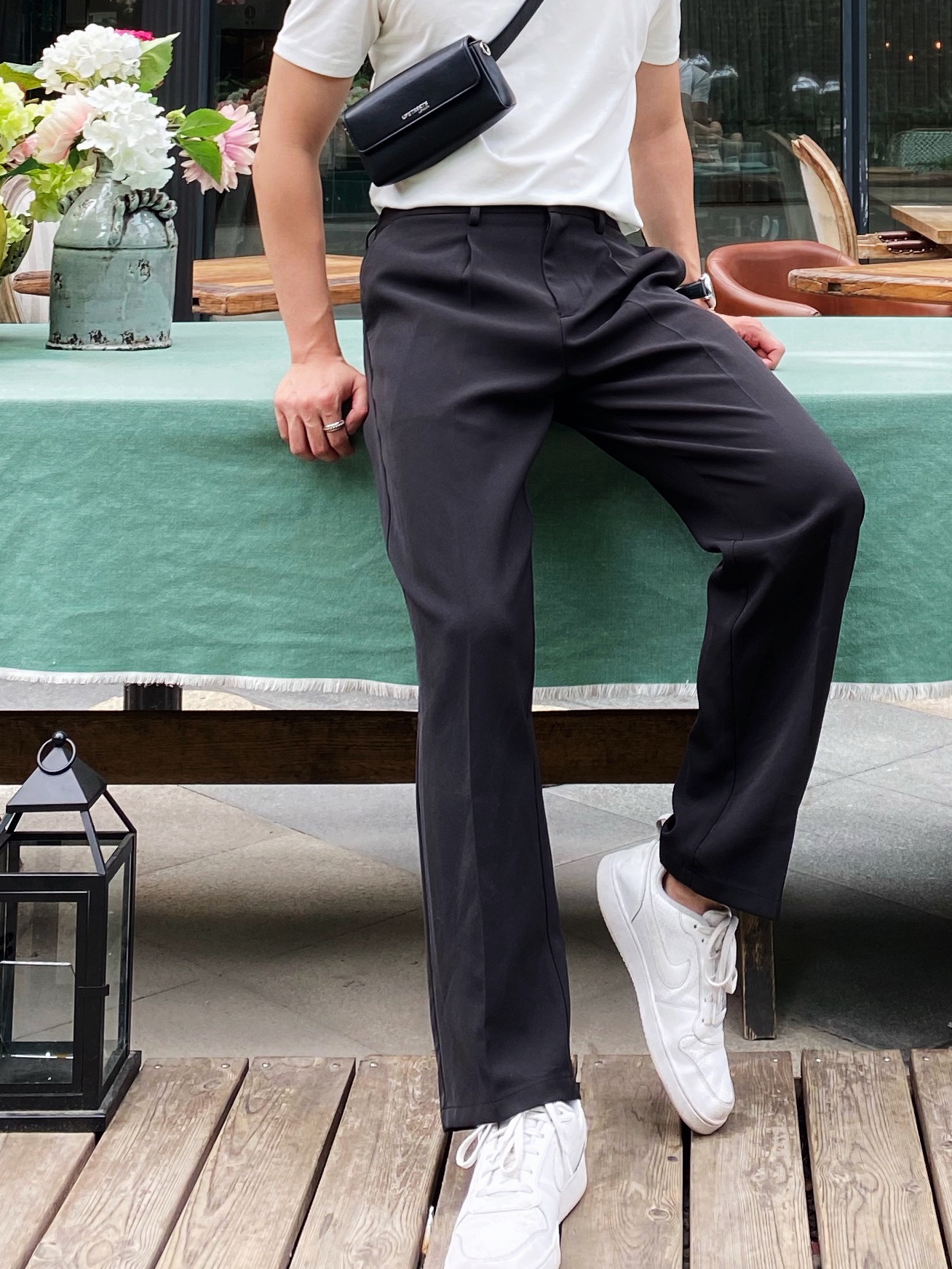 高腰的设计,拉长腿部线条,显瘦效果很好,高腰的版型,很显高挑,修身的剪裁,修饰腿部曲线,上身很有范。