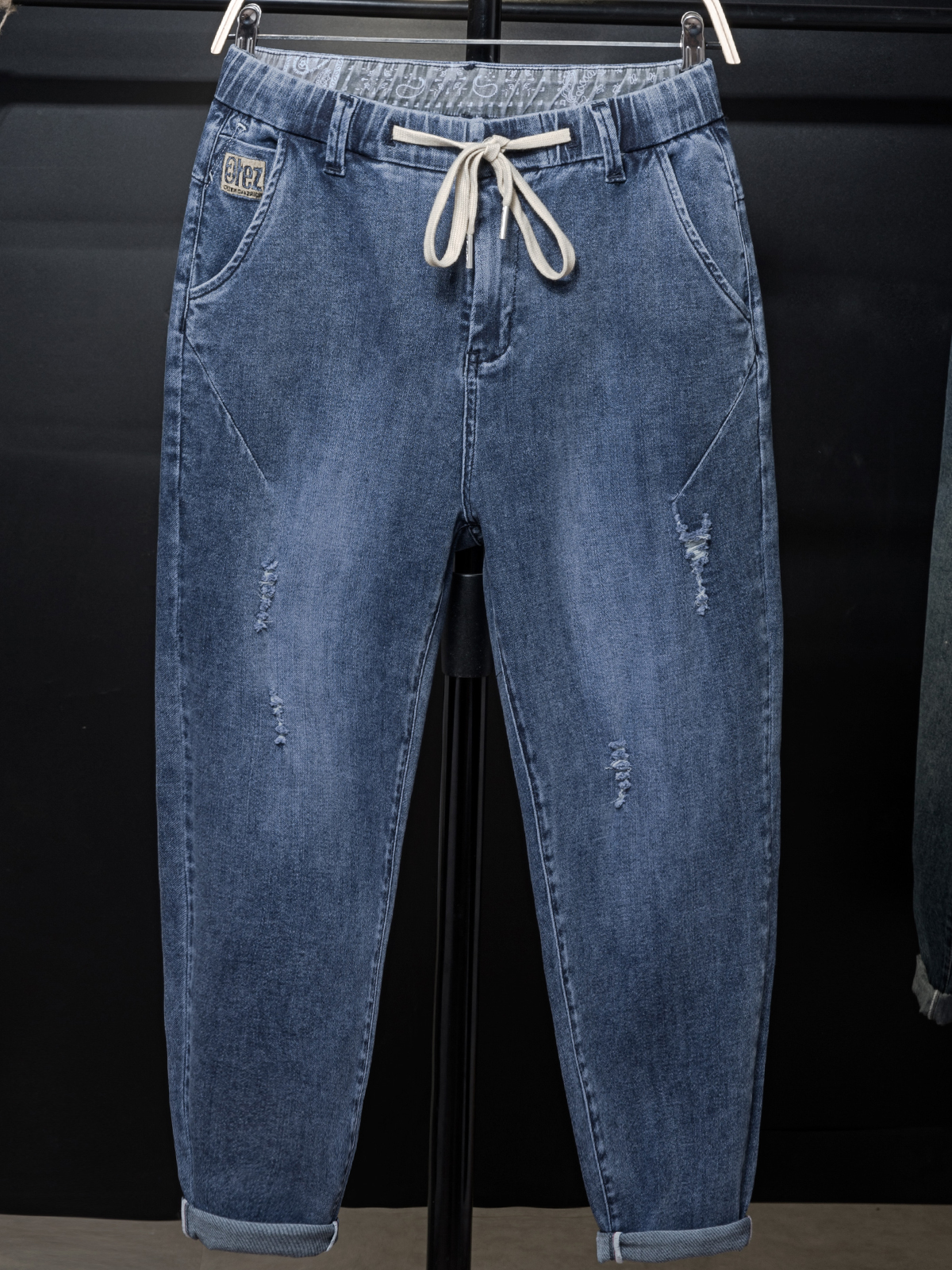 高腰设计,拉长身材比例。高腰牛仔裤,显瘦显腿长。直筒裤型,修饰腿部线条。