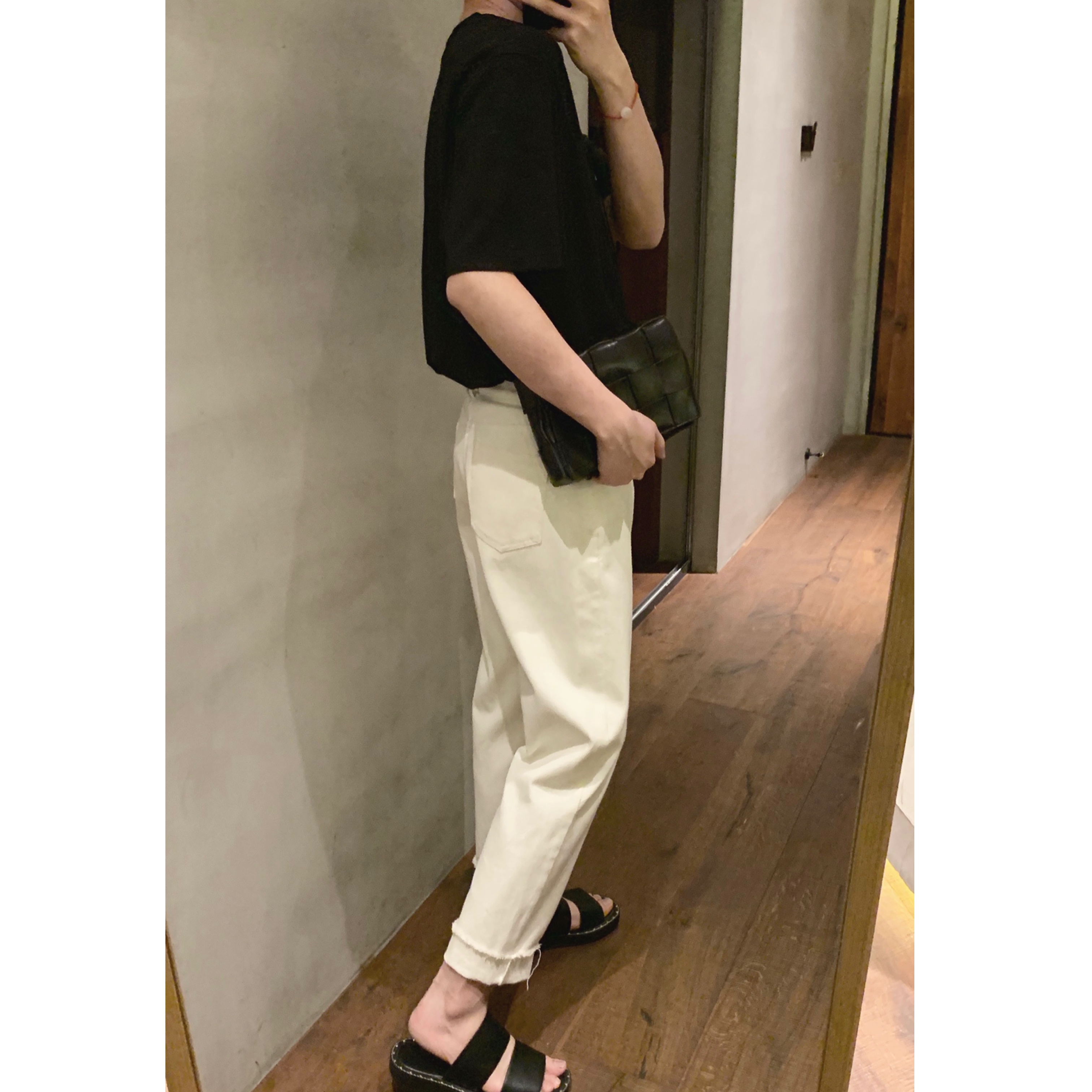 高腰设计,拉长身材比例。高腰牛仔裤,显瘦显腿长。直筒裤型,修饰腿部线条。