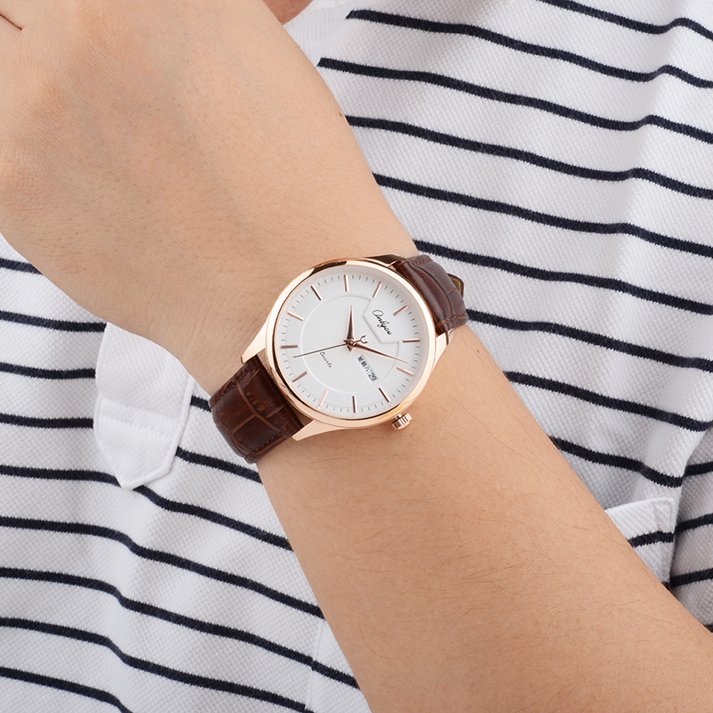 在材质上选用牛皮材质的表带,使这款手表的表现出十足的高级时尚的味道。