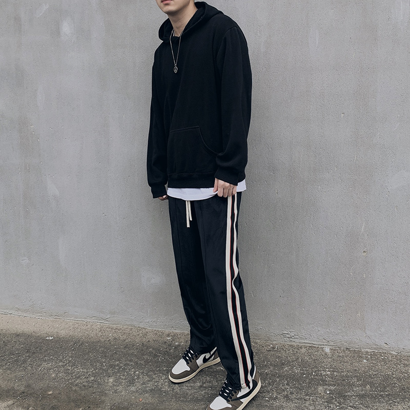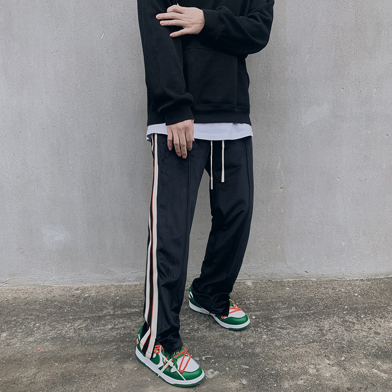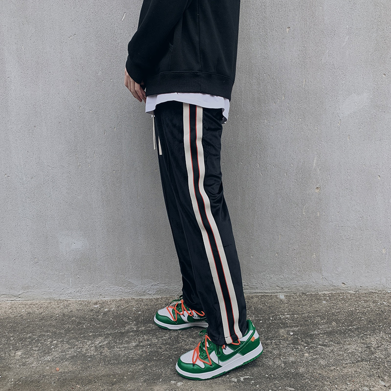 这款纯色长裤,自带一种街头风范。可以的穿上条纹T恤,下搭一双休闲板鞋。