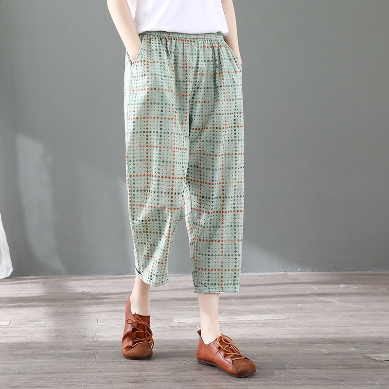 裤身的棉麻面料,穿着舒适透气,高腰的设计,很好的修饰了身材比例,裤脚的小毛边装饰,显得很有个性,九分的裤脚,拉长腿部线条,穿上很显。