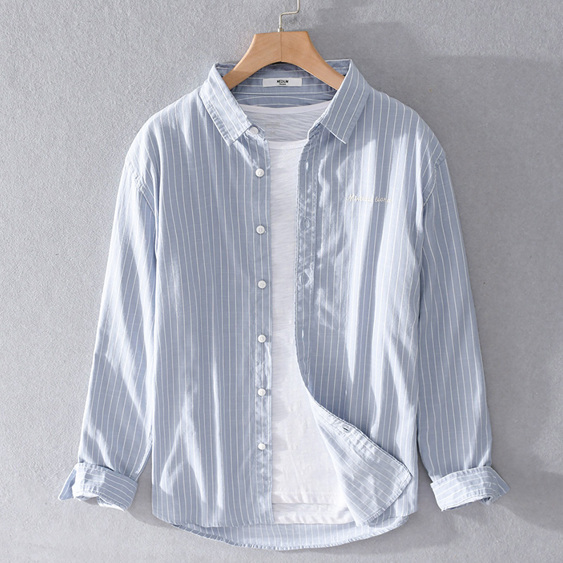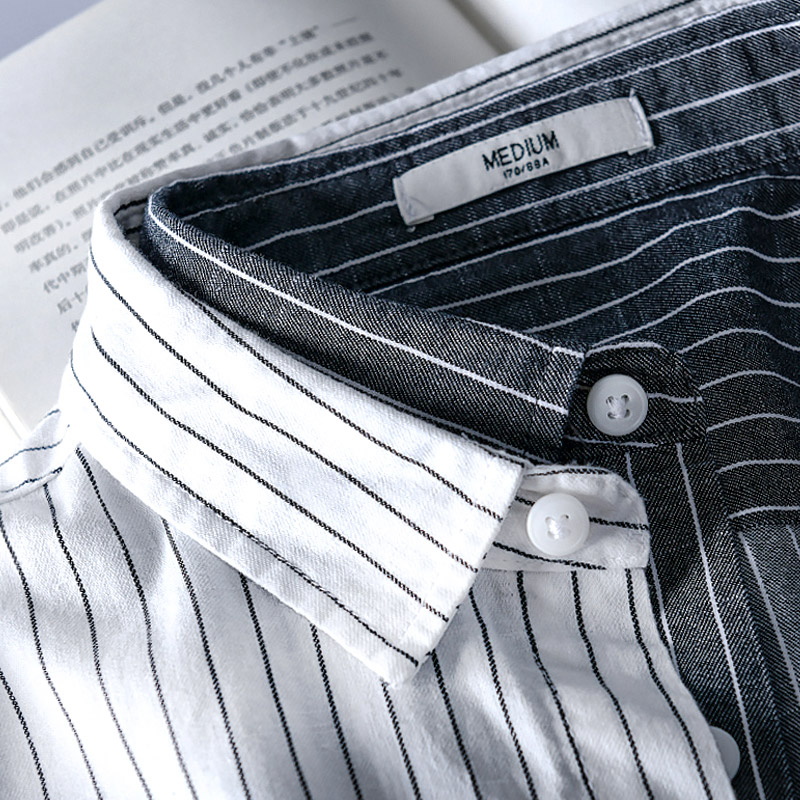 撞色条纹衬衫,采用了纯棉的面料,柔软细腻,穿着舒适透气,经典的圆领设计。