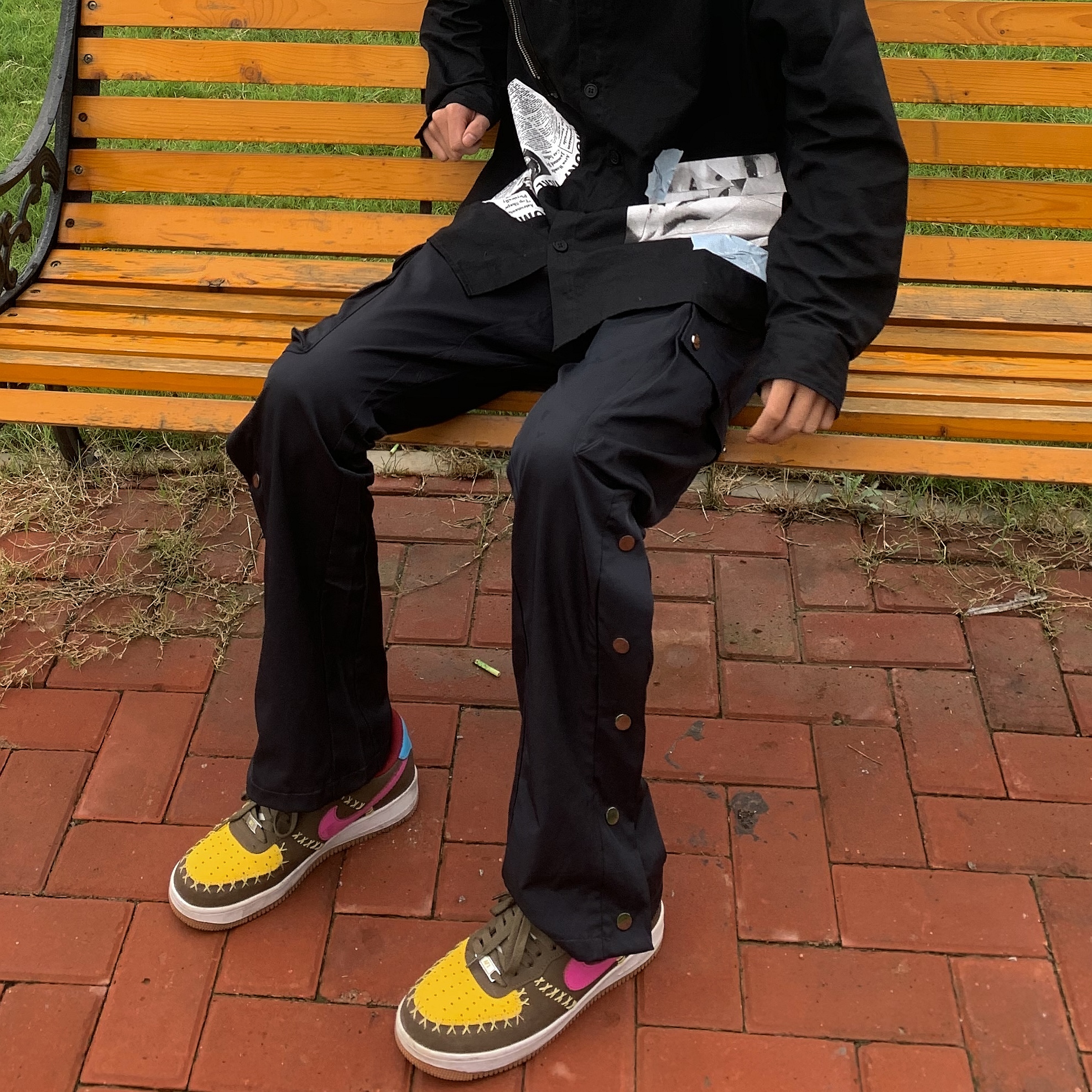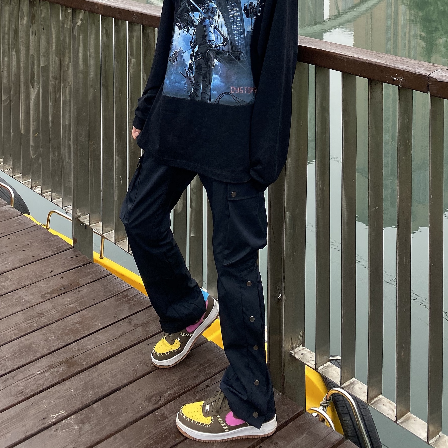 高腰裤型,拉长腿部线条,大口袋设计,方便日常穿脱,工装裤,休闲感十足,宽松版型,街头范儿十足。