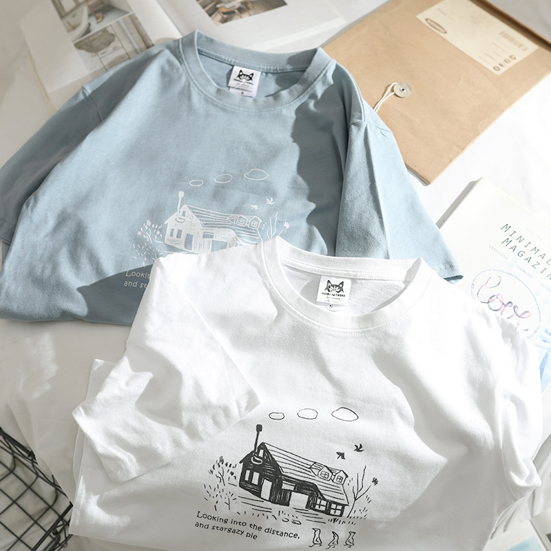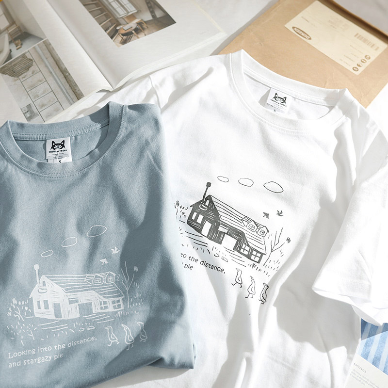 纯棉t恤,亲肤舒适,宽松的版型,上身舒适自在,卡通的印花,更显俏皮感。