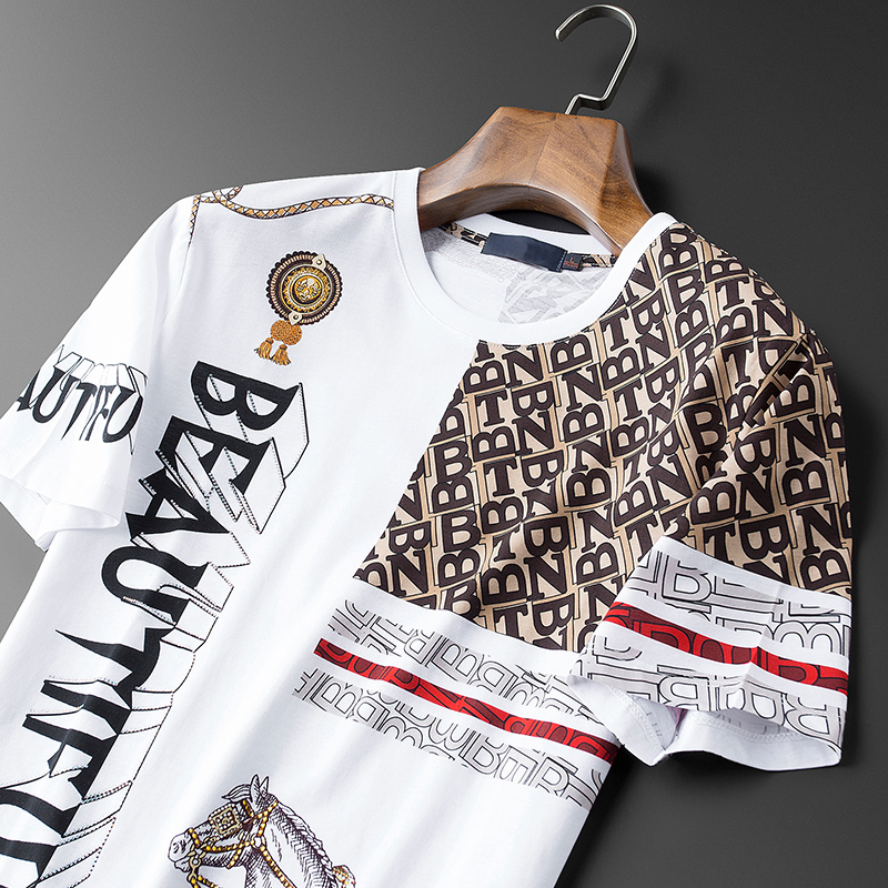 这款休闲时尚有特色的t恤,精致的领口,让男士魅力尽显而不一样的魅力,宽松的版型,遮肉又显瘦。