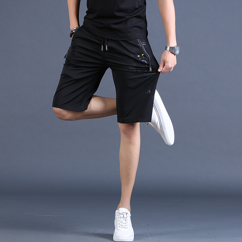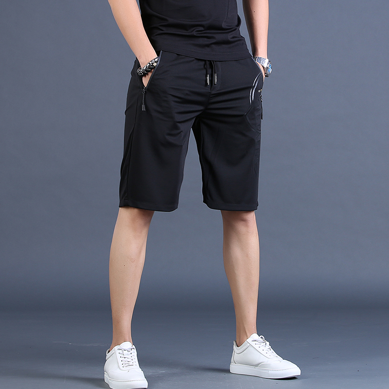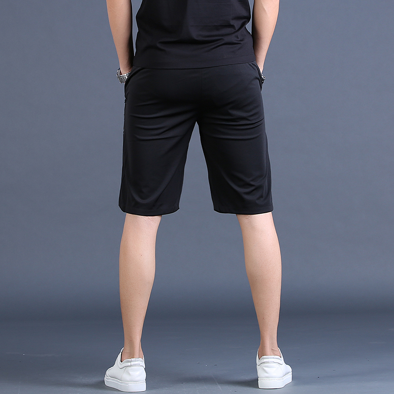 这款五分裤选用冰丝的面料,爽滑透气,吸湿性能好,上身凉爽不闷热。松紧腰抽绳设计,穿脱更加便利。