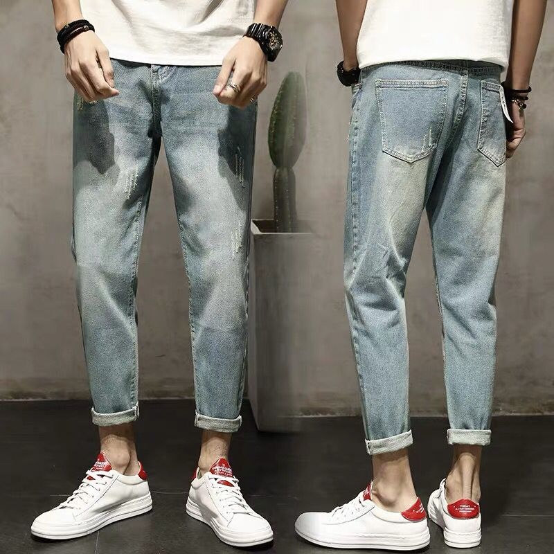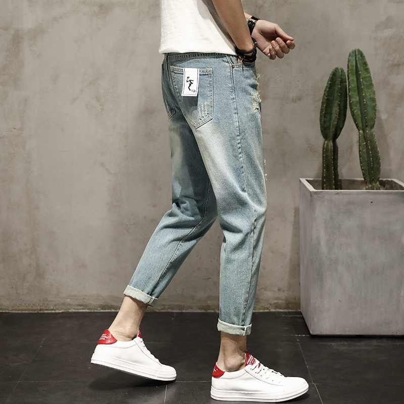 简约风的纯色牛仔裤,九分小脚款式设计,更加具有休闲味道。