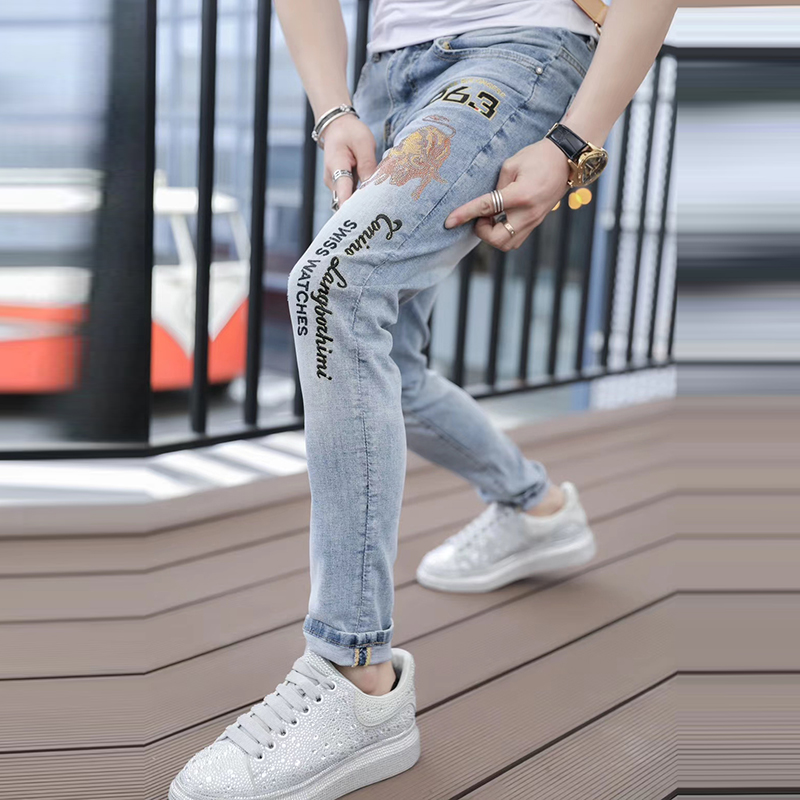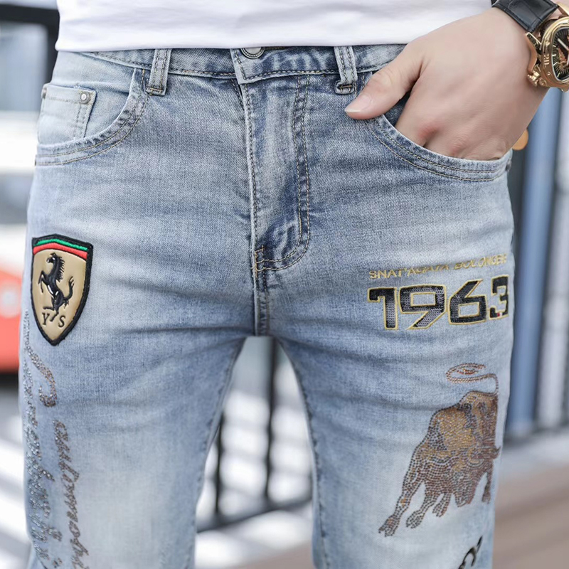 立体的修身牛仔裤,舒适亲肤。精致的烫钻图案设计,彰显卓越。修身的小脚裤搭配,上身效果非常的好。