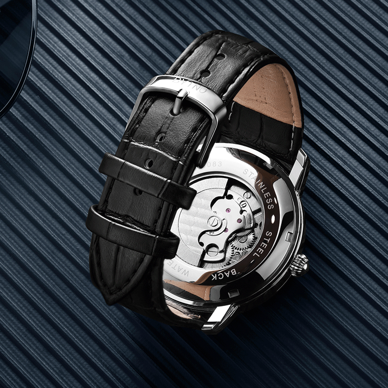 这款真皮机械腕表设计简单大方。表盘与表壳的线条设计,更符合当代商务风格,展现了优雅品味。