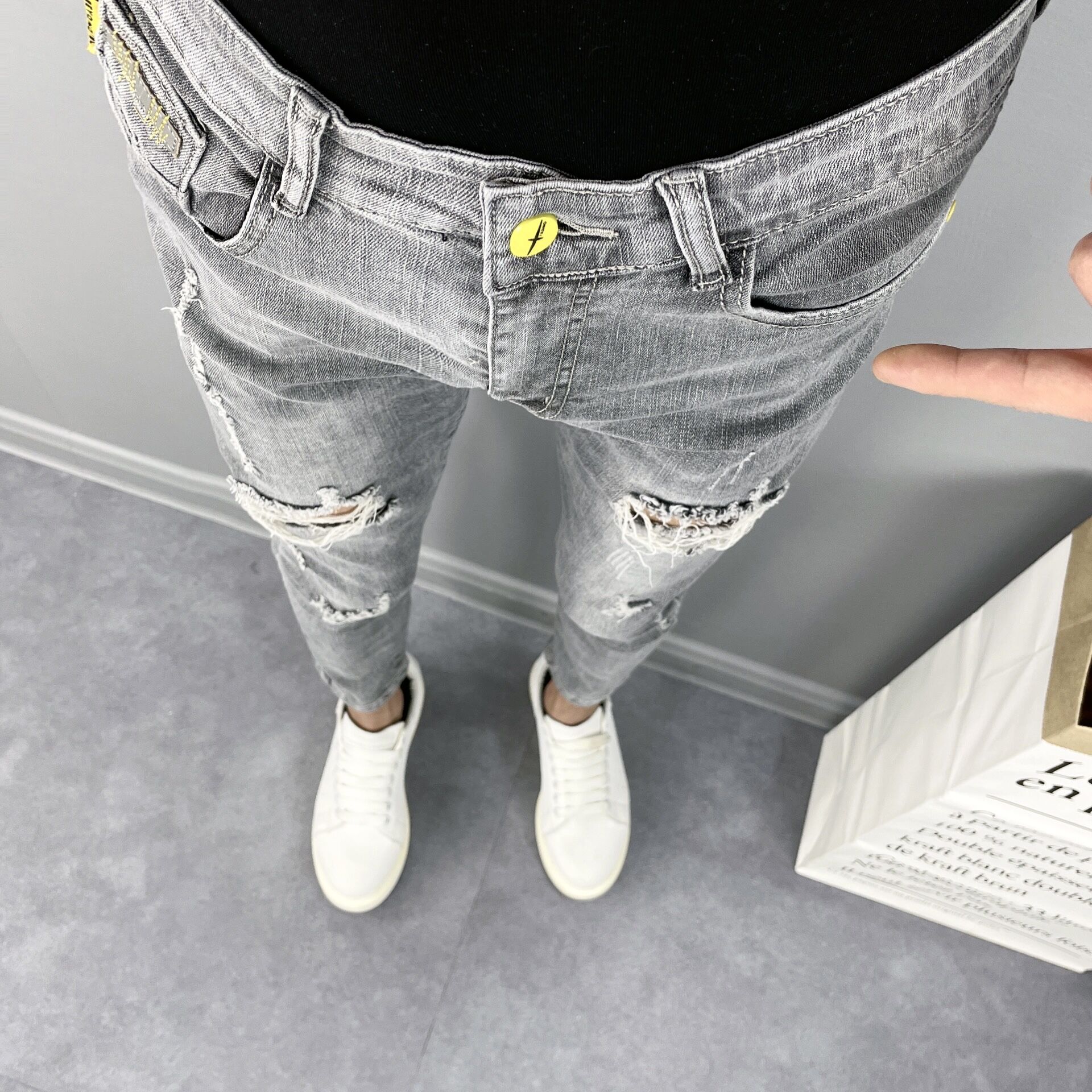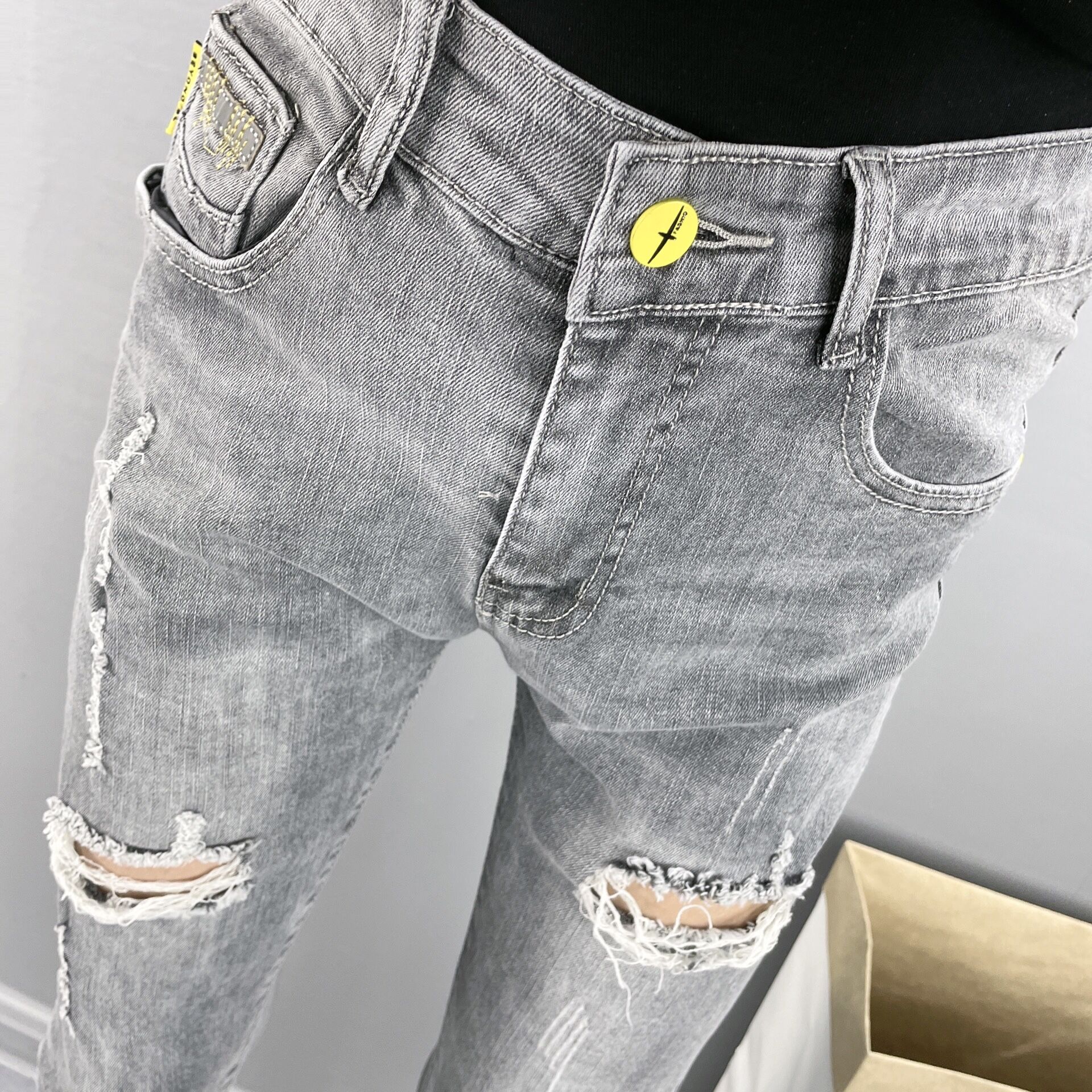 这款牛仔裤的设计很有特色,高腰的版型,很好的修饰了身材比例,显瘦效果很棒,搭配一件T恤,就能轻松穿出时尚感。