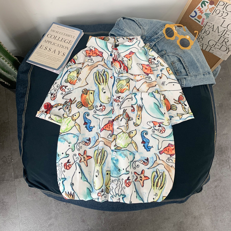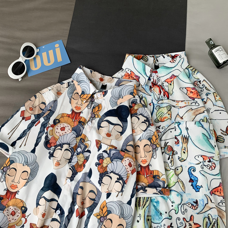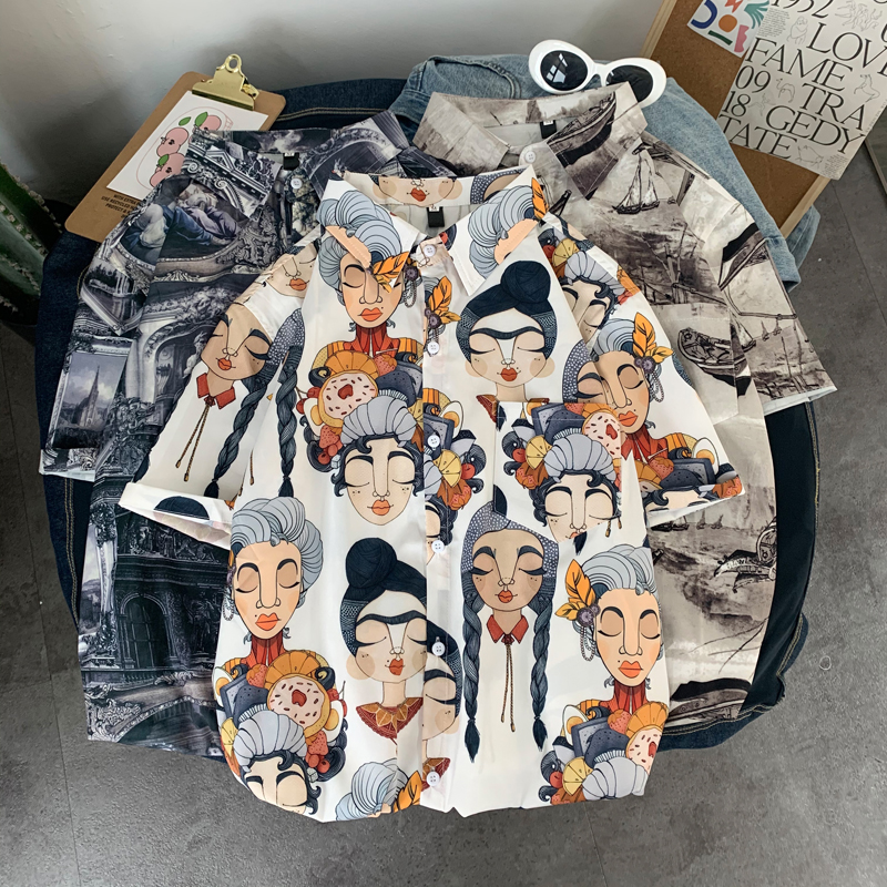印花元素的一款上衣,衬衫翻领设计,干练时尚。