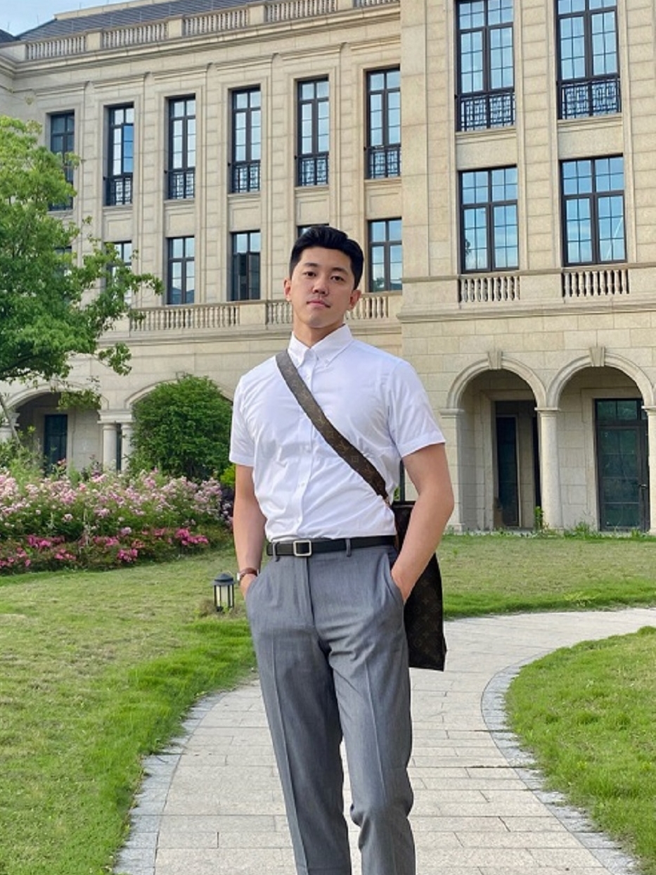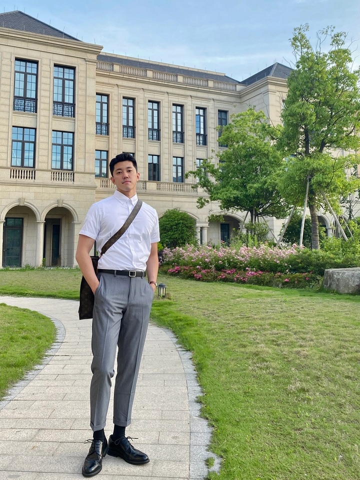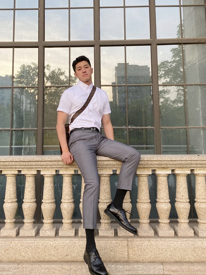 对比较正式的场合,我会搭配一条铅灰色的裤子,它不像纯黑给人特别古板的感觉,又能很好的区分开我的腰线,让身材比例的重心往上移一些。而且即便是朋友聚会,这样的穿搭也不会显得特别正式,一样能很好的hold住全场,从容应对
