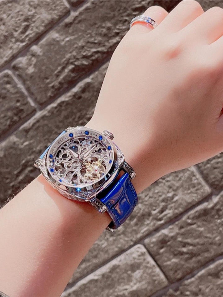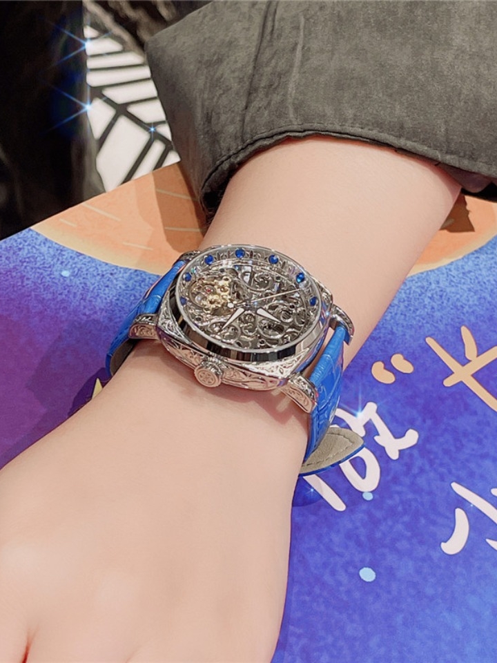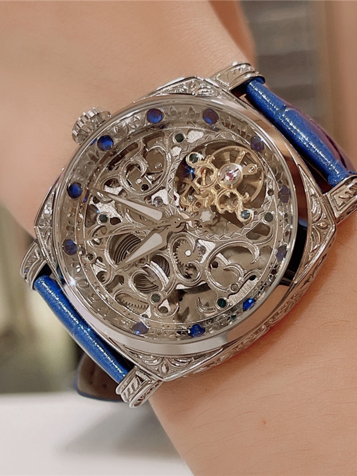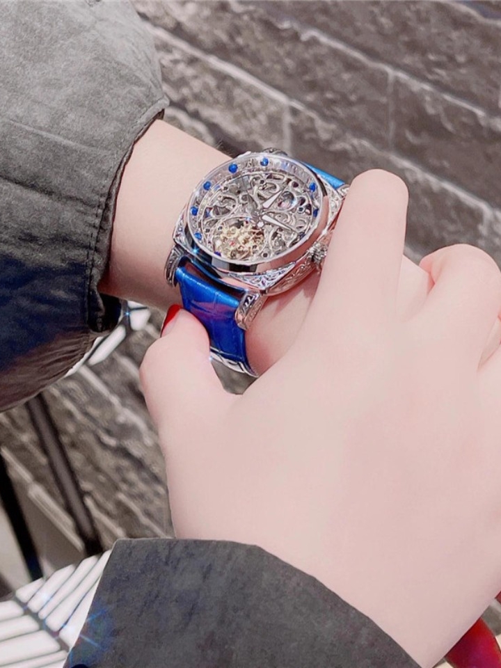 镂空全自动防水机械手表,镂空摆陀,更显大牌风范,全透视表背设计,完美演绎机械动态美;银白色的精钢表壳,皮质表带坚实耐戴舒适,表针精准。