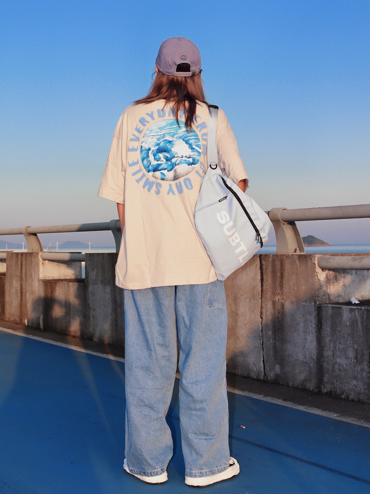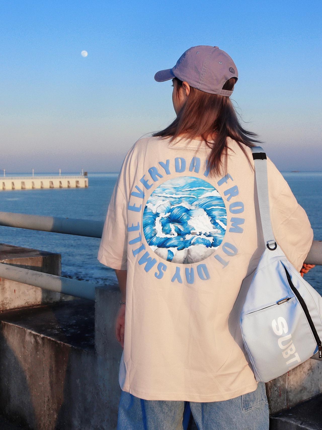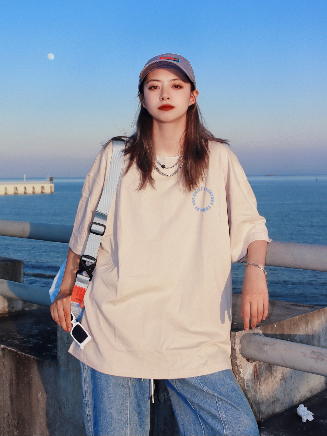 宽大版型T里最喜欢的一件,后背油画印花的设计,面料压得很密,宽松版型面料非常舒服,袖子设计比较特别,五分落肩袖,男女同穿,用来做情侣装再合适不过了。超级透气,颜色是温柔的韩系卡其色,已经手洗了两次领子没有变形。
