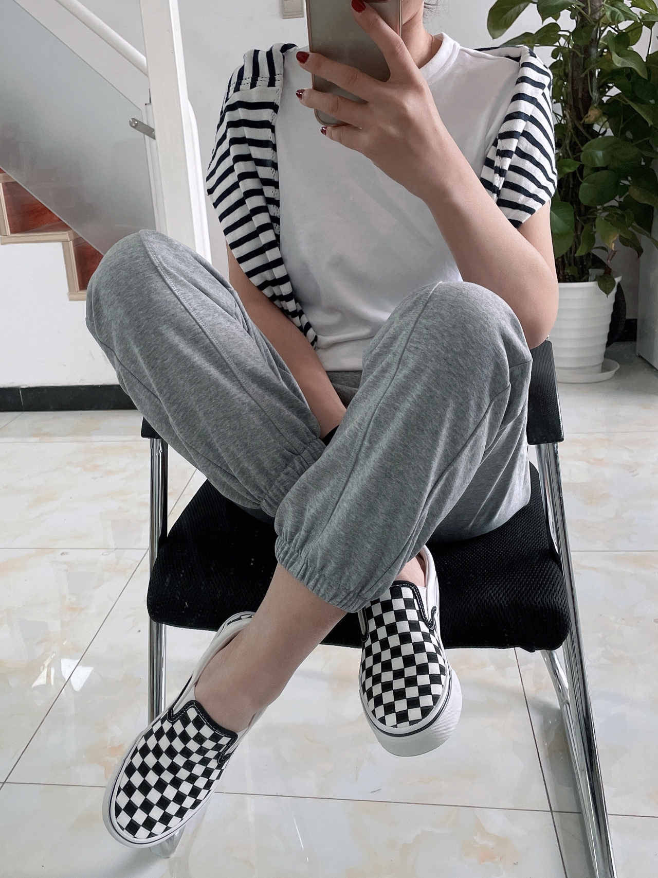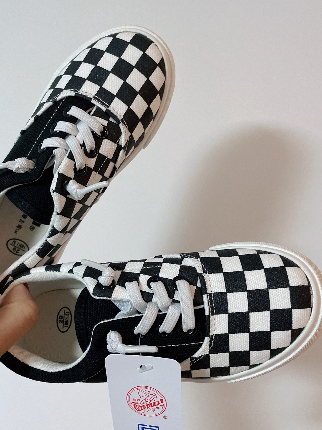 周身没有任何标志,没有回力的logo,就是非常简洁的棋盘格,格子印的也比较规整,看起来非常舒服。很跟脚,而且很好搭衣服,我随便穿了一个白衬衣牛仔裤就很好搭,整体是比较软的,性价比很高。