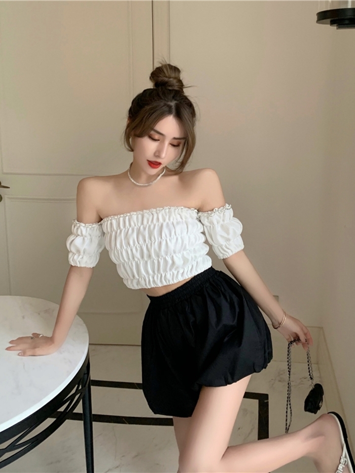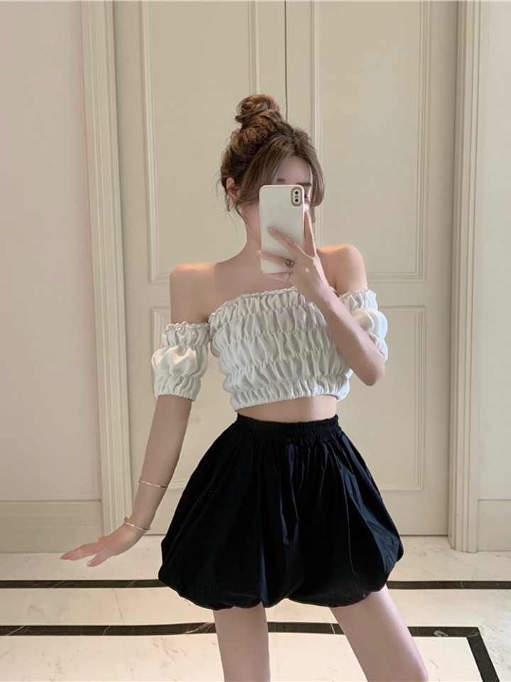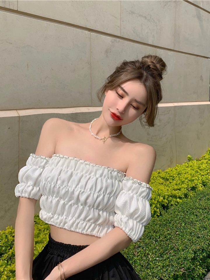 小清新的T恤上衣,一字领的设计,凸出性感的锁骨,浑圆的肩线以及细长的脖颈。自然的皱褶肌理面料,轻柔飘逸,上身舒适。