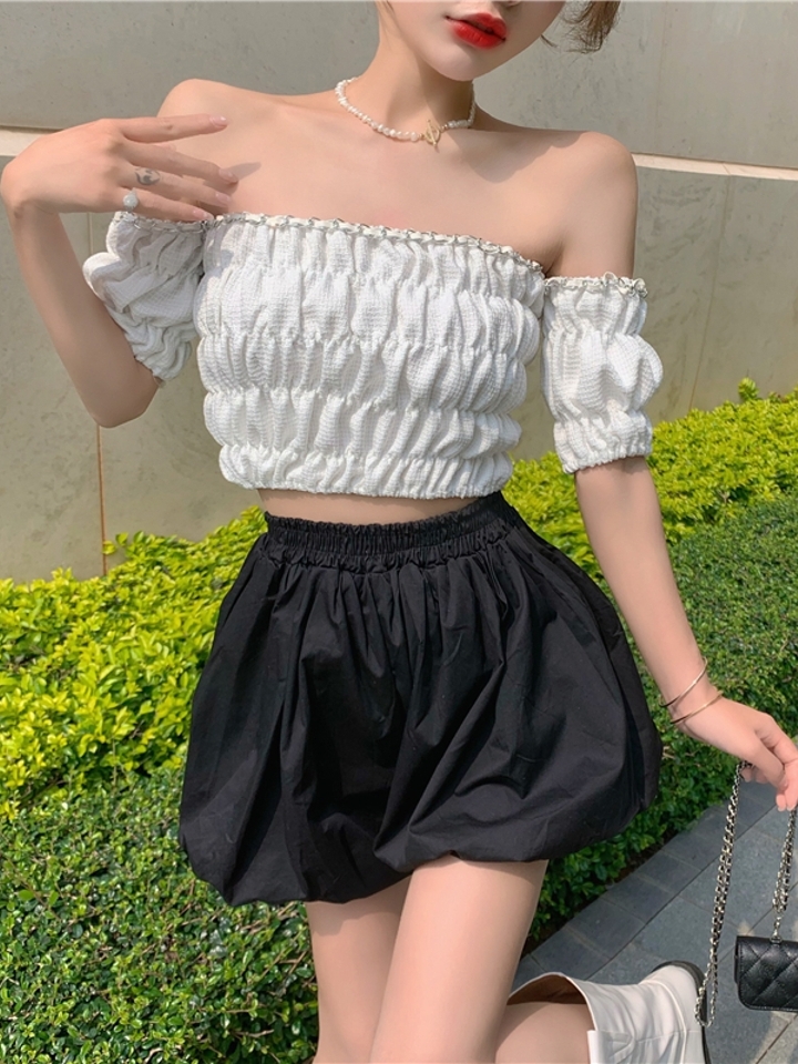 性感一字领设计露出肩部和锁骨曲线尽显性感女人味,别致清新的泡泡袖设计展露出古典气息,搭配撞色的百褶裙,提升时尚感,展现女性的温婉。
