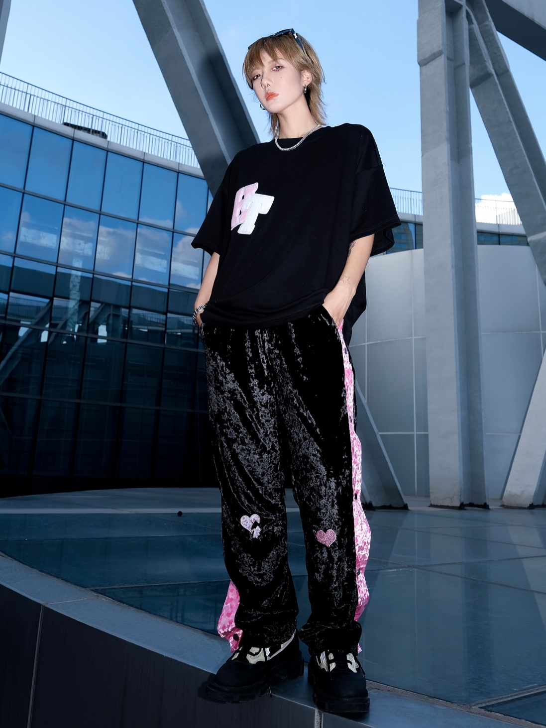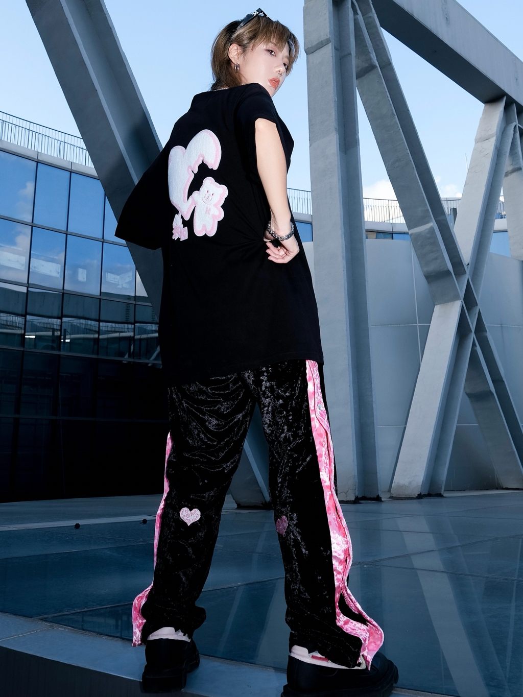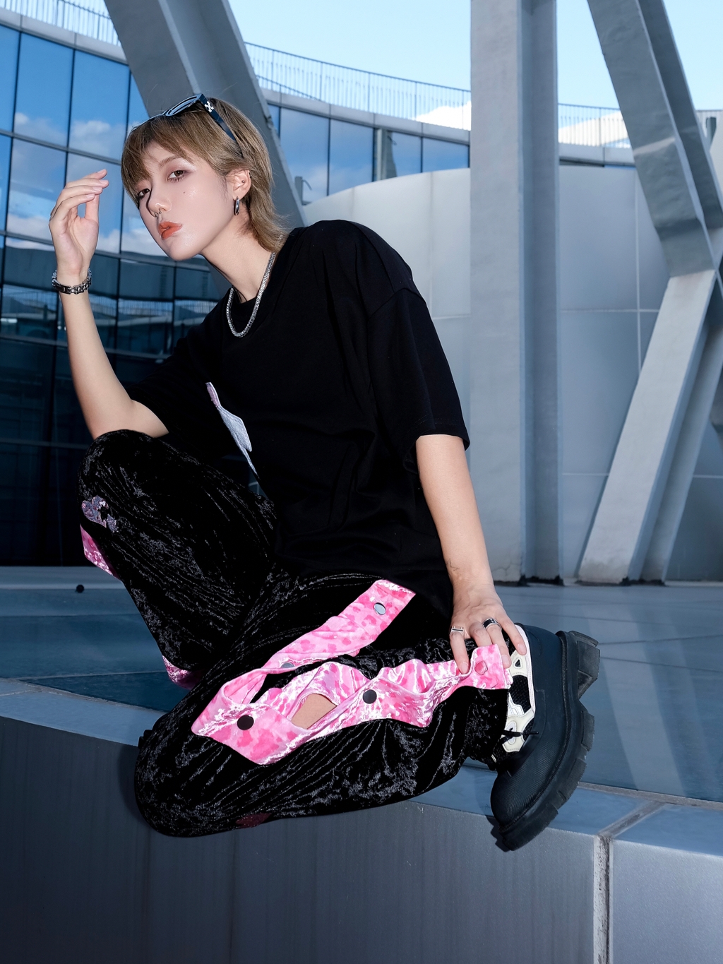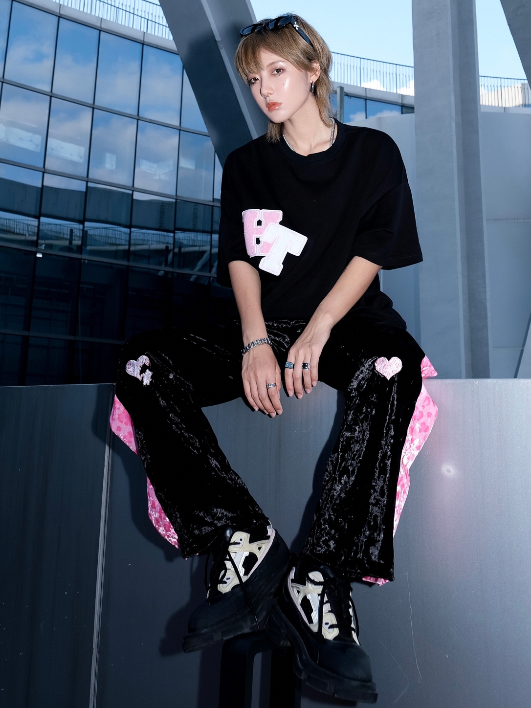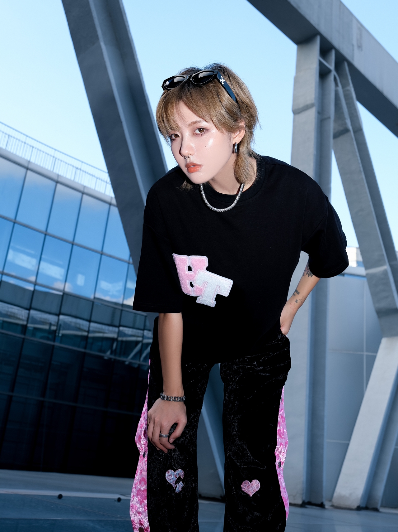 大面积粉色怕显母,可以试试小面积穿搭,T恤、裤子、鞋子上面的粉色呼应,看起来就感觉很用心的在做搭配。